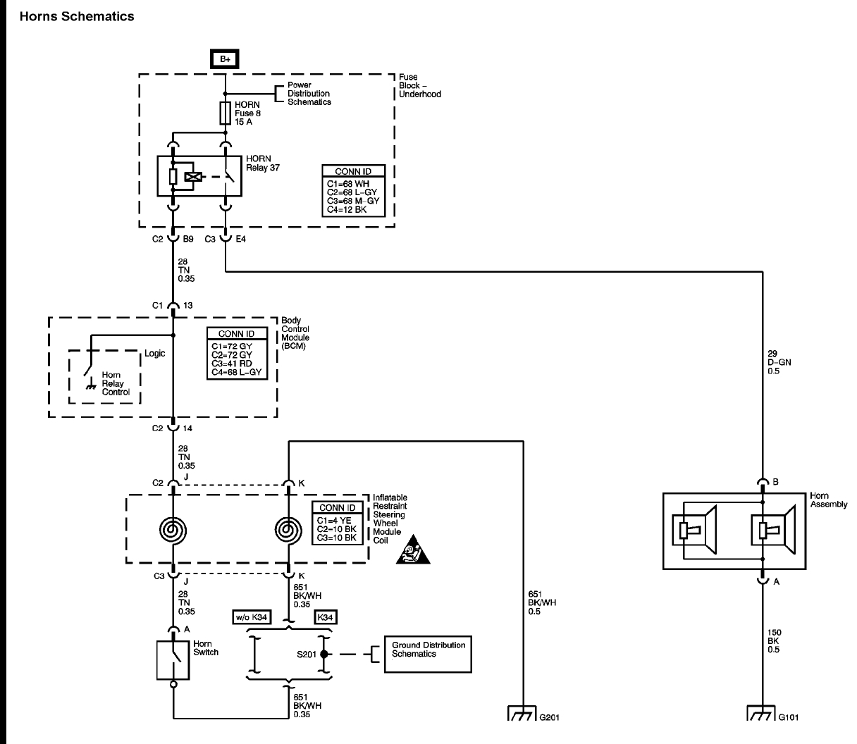 I pulled the horns and put power directly to the connector, no sound. I will pick up replacement horns tonight. Is there a way to test the horn switch in the steering wheel cover? If I pull the air bag assembly should there be an ohmic value from the ground connector and the red wire? Should it go to 0 if I press on the horn symbol?