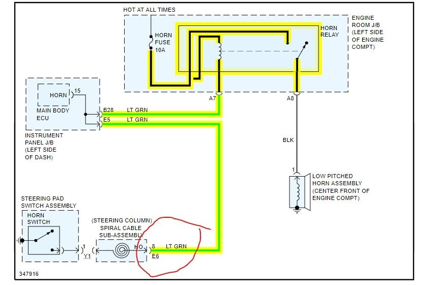 Ground the wire I circled and see if the horn goes off.