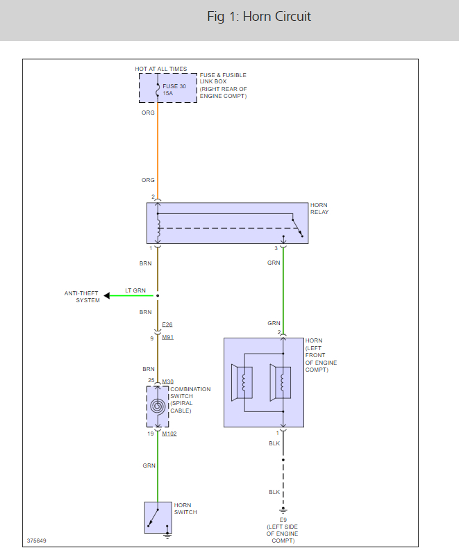 Let start by checking the fuse #30 in the under hood fuse panel. Here is guide to help check for power at the fuse and the horn wiring diagrams so you can see how the system works and the fuse locations well: