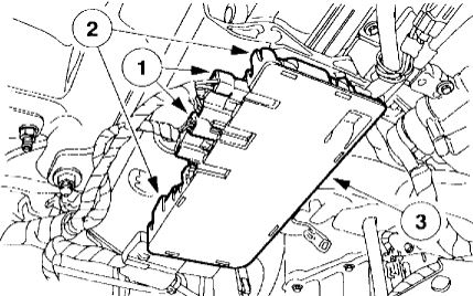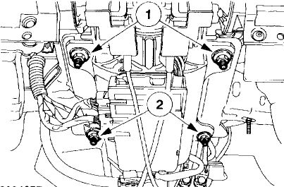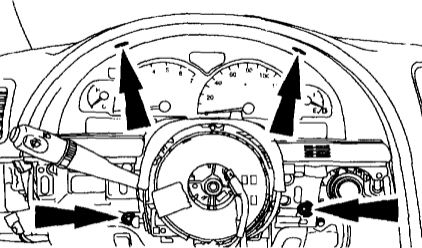 Next step is to lower the steering column enough to get the upper trim panel for the dash off. Remove the nuts marked as 1, loosen the ones marked 2. This will allow you to rotate the column down enough to remove the panel trim. Remove the screws and move the panel enough that you can disconnect the automatic temperature sensor from the panel by squeezing the tabs in.