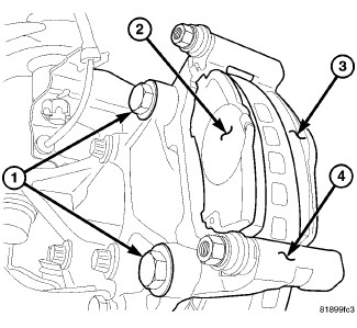 Remove the 2 caliper mounting bolts (3).