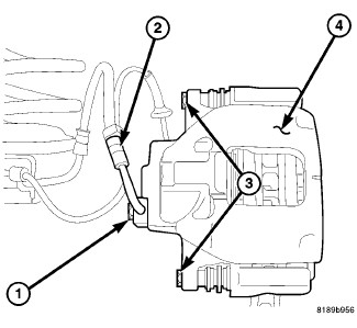 Secure caliper (4) to nearby suspension part with wire. Do not allow brake hose to support caliper weight.