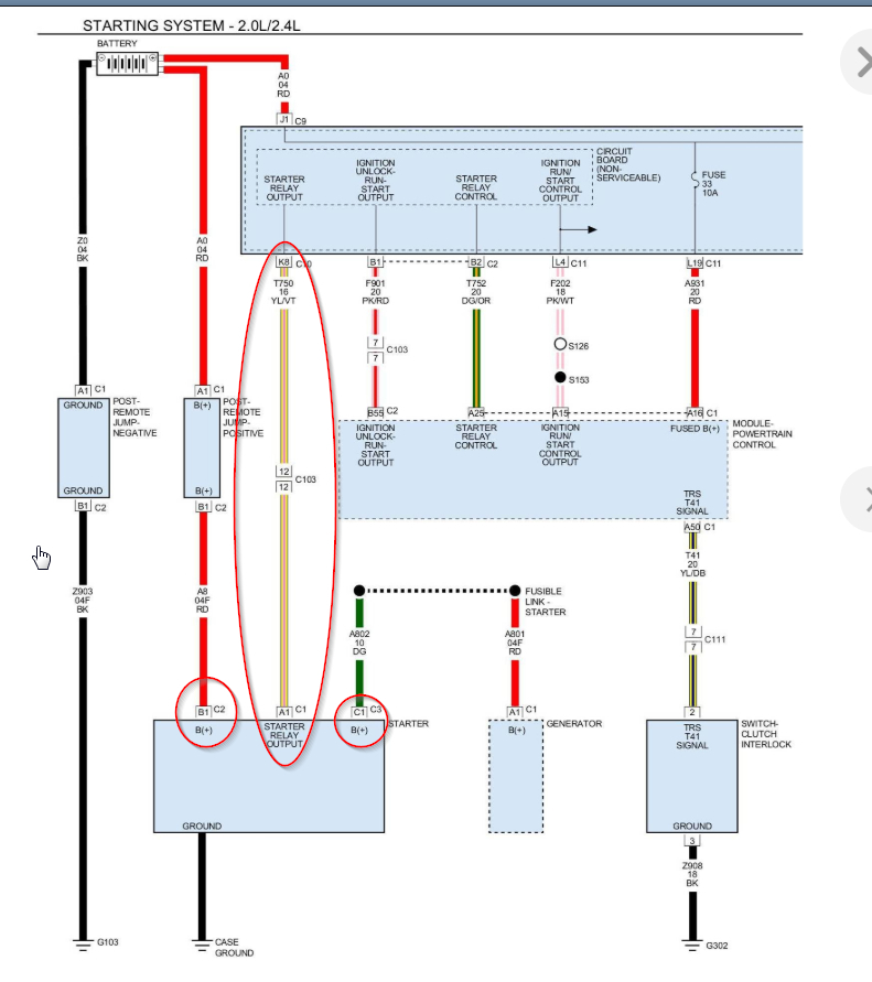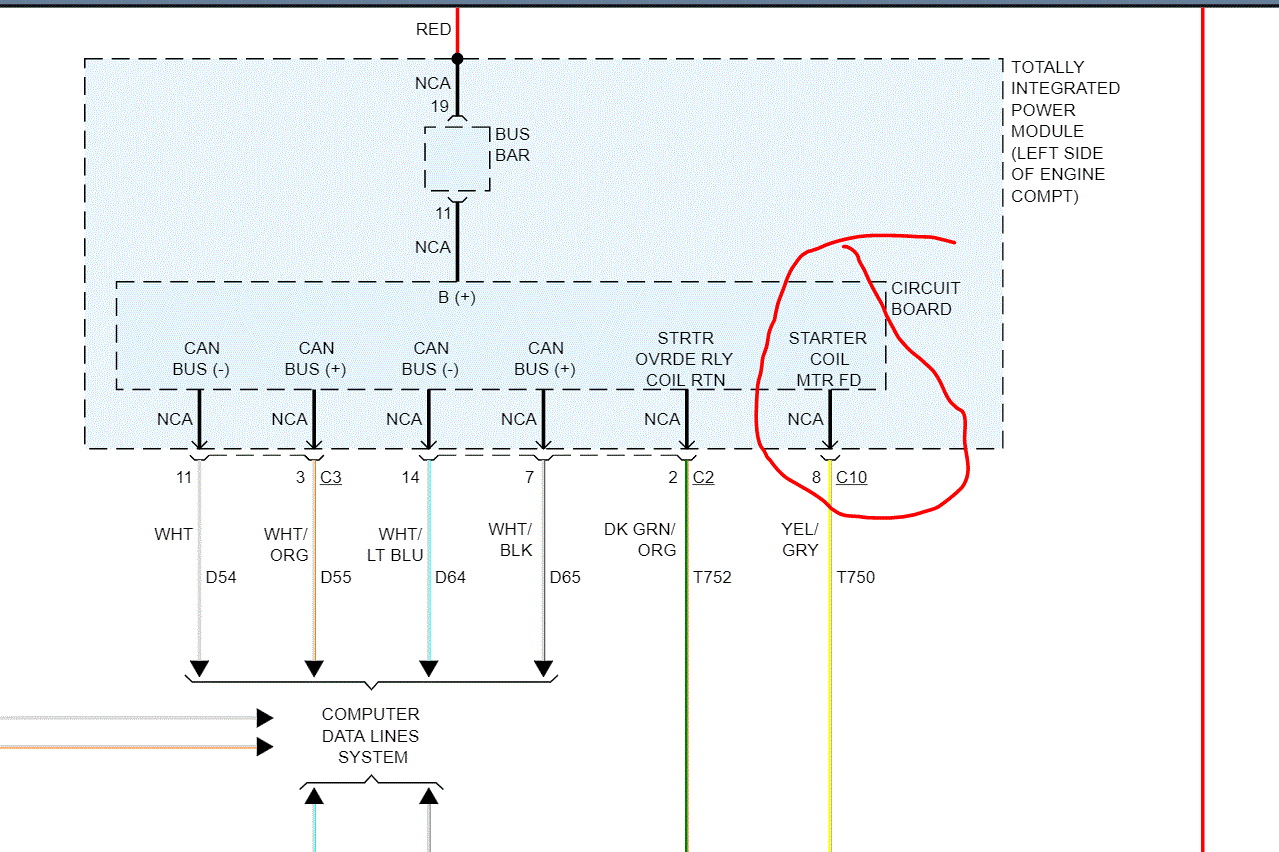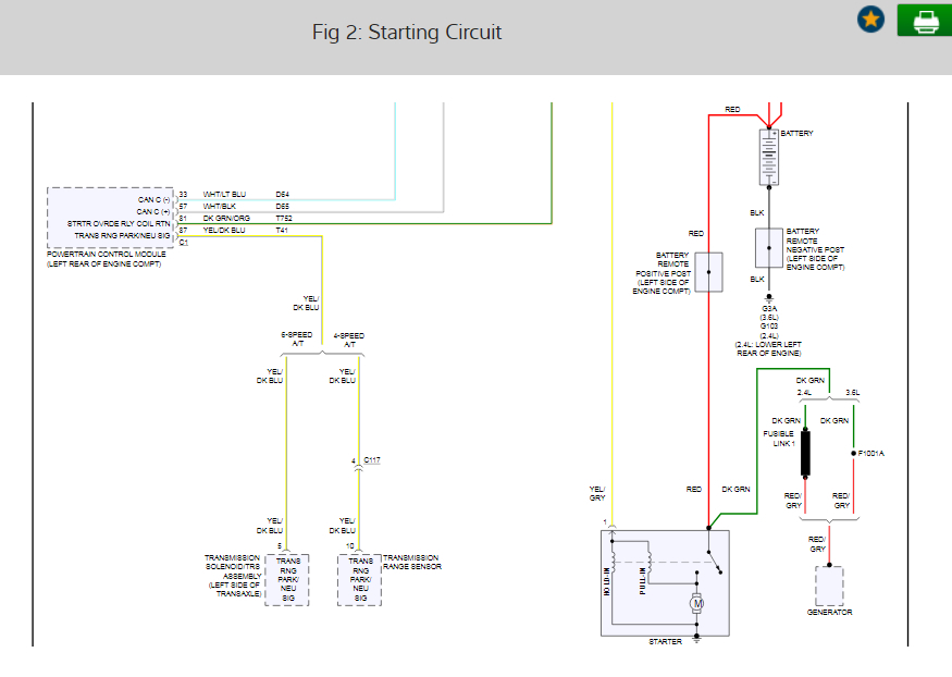 If that is good, then we need to check for power at the yellow wire on the starter motor. That wire comes from the totally integrated power module (TIPM). See pic 2. You may get enough power to cause a noise, but not engage the starter.