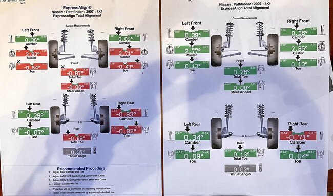 Dandy news. The first thing that stands out with the alignment is they have their computer set to read to hundredths of a degree. I did that with mine too. That shows your mechanic values precision over speed. The computers can be set to read to just tenths of a degree, then it rounds off the numbers. You lose the precision, but the adjustments take less work to get them to turn green, (in specs).
