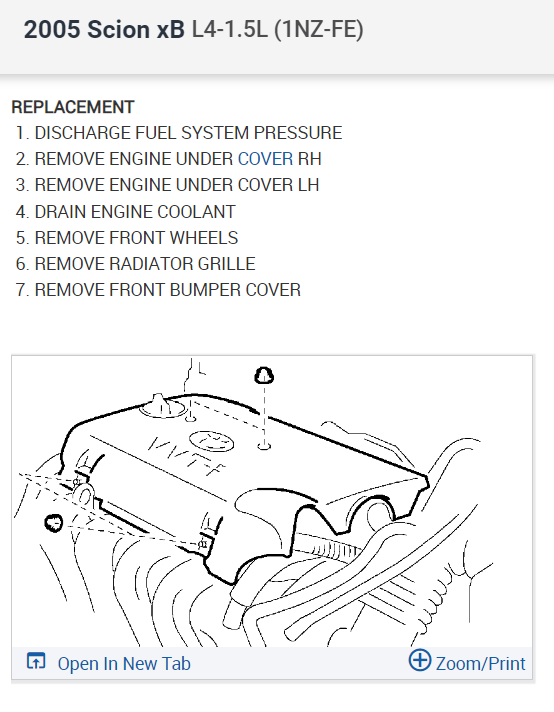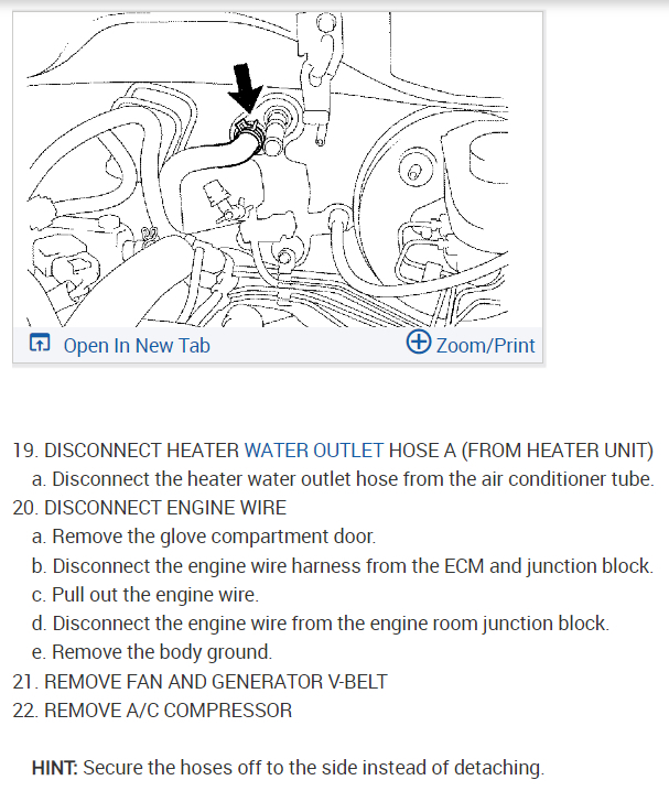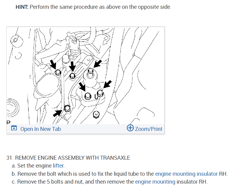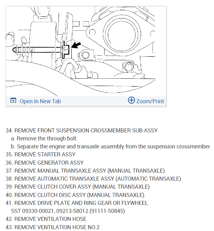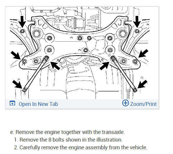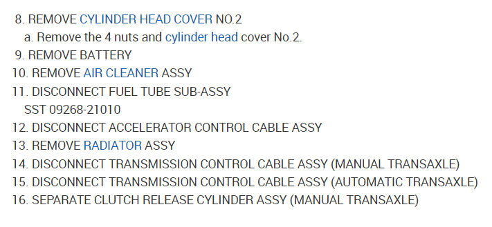 You will need to start by draining the engine oil and coolant, disconnect the battery. Also, the instructions call for the removal of the engine with the transaxle which will come out from the bottom. Remove the CV axles and the car will need to be lifted. Here are the instructions on how to remove the engine and transaxle. Check out the images (below). Let us know if you need anything else.