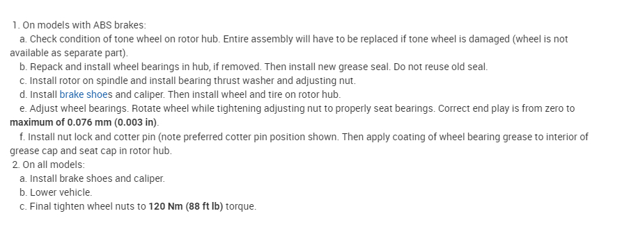 See pics below Note: On pic 3 it indicates to install the spindle nut, install the tire/wheel, and then adjust. I never install the tire and wheel until after adjustment and everything is together. Also, don't place weight on the bearing until adjustment.