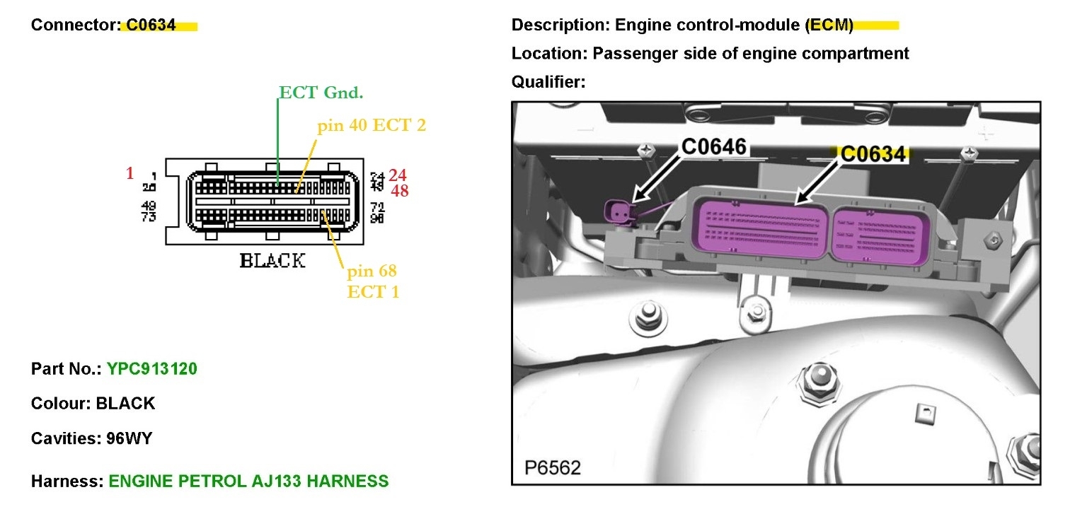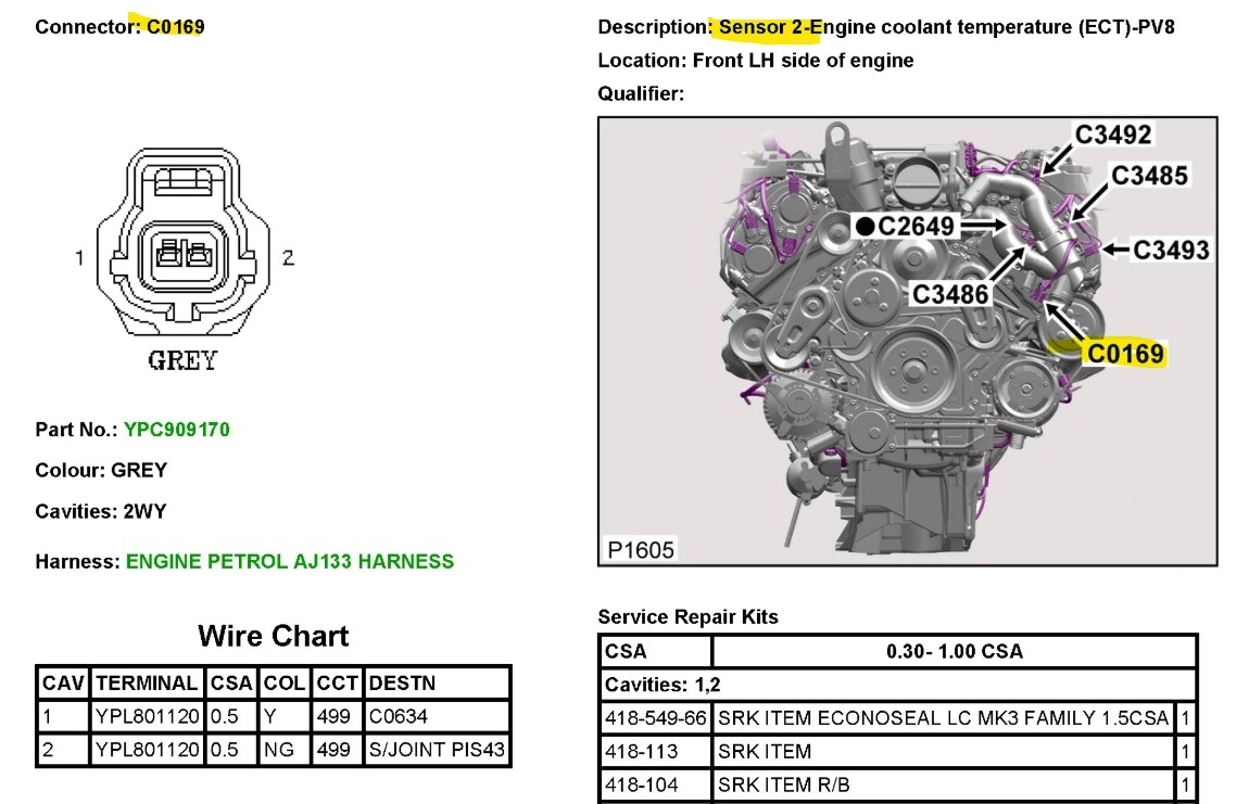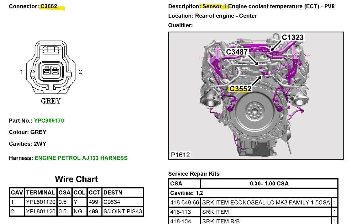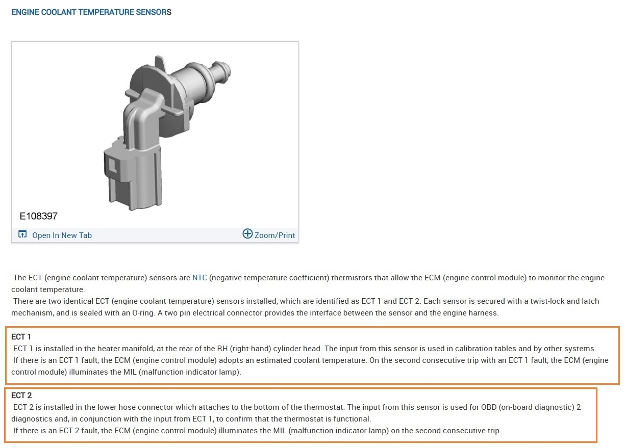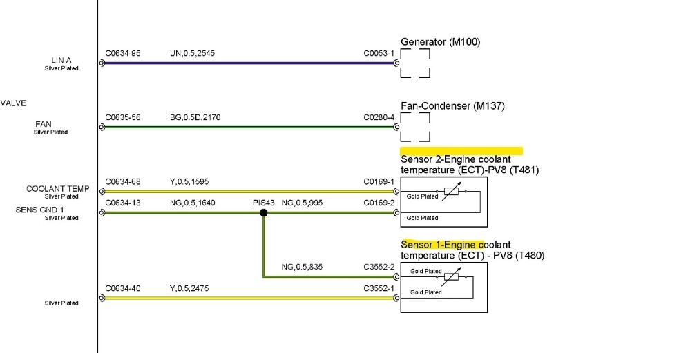 Okay, you should definitely be reading 5volts on one of the wires when the sensor is unplugged. It looks like the Yellow wire should read 5volts, the other wire is the sensor ground through the ECM, there is a TSB that came up, I will post it, I havent gone through the entire bulleting yet, but it does mention a bypass hose that it supposed to help with airlock, which will cause the ECT to read incorrectly if air is trapped at the sensors location, ECTs cannot read the temperature of air, only liquid, but a low 5volt reference is concerning as well. One temp sensor is located on the front of the engine and the other on the rear (diagram 2) just above the flywheel area. This is the OEM wiring diagram that also shows two temp sensors, you may need to cycle the key for the temperature to change, or it might be the other sensor, I'm not 100% sure on the two sensors, if that's for a different engine setup, but it's just what I'm seeing, let me post this TSB though, I think it will resolve your coolant issue.