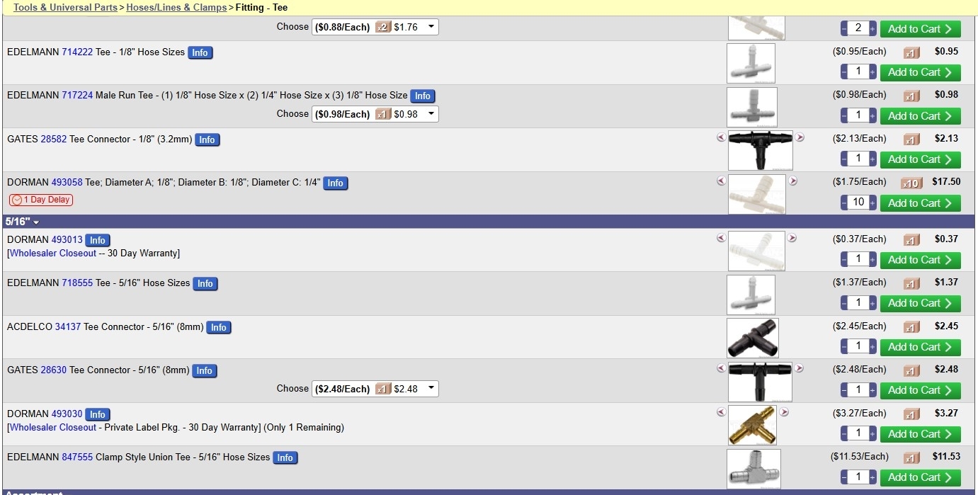 I will take a look, since I'm checking on parts for another vehicle right now anyway. Basically, you need to find T fittings that can take the heat, I know when I go to AutoZone or local parts store for basic stuff, they have a section where they keep pretty generic hoses and random parts that are not for any specific model. Or do a google search for something equivalent to what you need. But I will look for a few minutes here. Sometimes you have to get creative if parts are not available from the dealership.