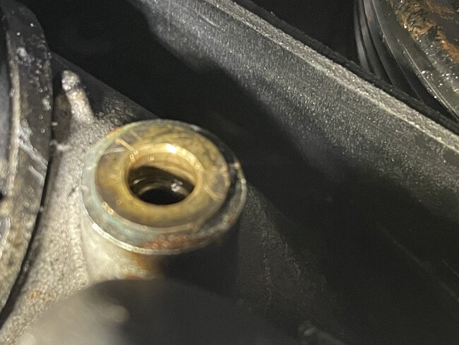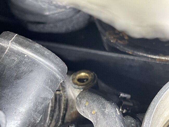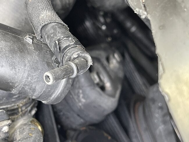 Was finally able to get some hoses and fittings. Deleted all codes abd started it after i filled the expansion tank and removed the bleed screw on top of it after i capped it, then added more water and started it. 2-3 minutes later i got heat, barely opened the bleed screw on top of the heater core hose and let some bubbles out. Fan didnt come on when i started the truck like it did before so that was good. Temperature climbed to 122f which was gradual. But then noticed some water coming out of a small hose so turned it off. Its this hose which is new. The small end circled is where water is shooting out of and the end is not all the way in, tried to oush it more but its not going maybe ill wait till its cool and not spraying. Is there a way to find out how this thing fits in and doesnt come out? Is there like a rubber grommet that holds it in? This is a new hose because my helper broke that hose so he replaced it but i cant remember how it comes off or goes in. He is done, done few bad jobs so he is out. So am trying to find out if all it is is a grommet inside the hole where that hose goes in. The end of the hose has a small nipple basically.