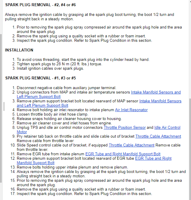 Please see the attached documents. Unfortunately you need to remove the intake plenum in order to remove the plugs. Not the easiest job but if you take your time, it is doable.