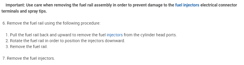 As far as the fuel injectors, I attached the directions for removing the fuel rail first and then the injectors. If you do this, make sure to replace the o-rings on the injectors. Also, I always put a small amount of Vaseline on the O-rings to make sure they aren't damaged when reinstalling them'