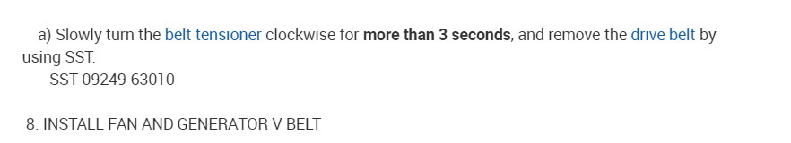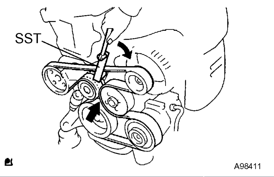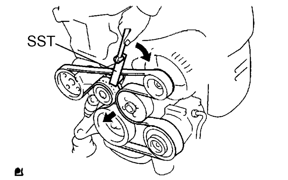 a) Slowly turn the belt tensioner clockwise for more than 3 seconds , and remove the drive belt by using SST.