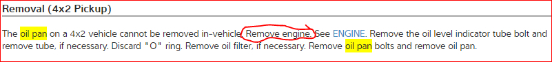 Unfortunately, the Ford service guide states the engine needs to be removed to gain access for the oil pan removal. Sometimes there can be enough clearance to remove with engine in vehicle but the service guide says no (circled in red). Hope this helps and feel free to ask any questions if needed. Danny-