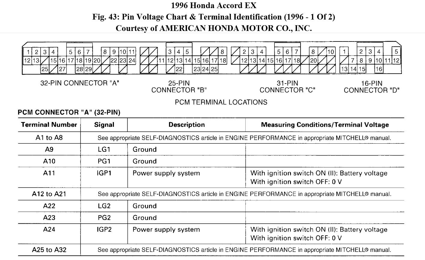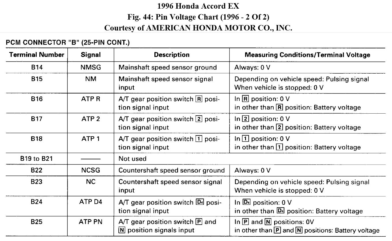400-600 ohms, disconnect PCM 25-pin connector "B". Check continuity between ground and PCM 25-pin connector "B" terminals No. 15 (Orange/Blue wire) and No. 14 (White/Blue wire). See Fig. 43 and Fig. 44 .