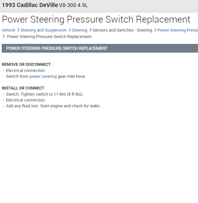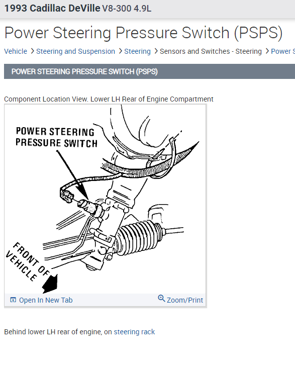 The power steering switch is located behind lower left hand side, rear of the engine, on the steering rack (see diagram below).