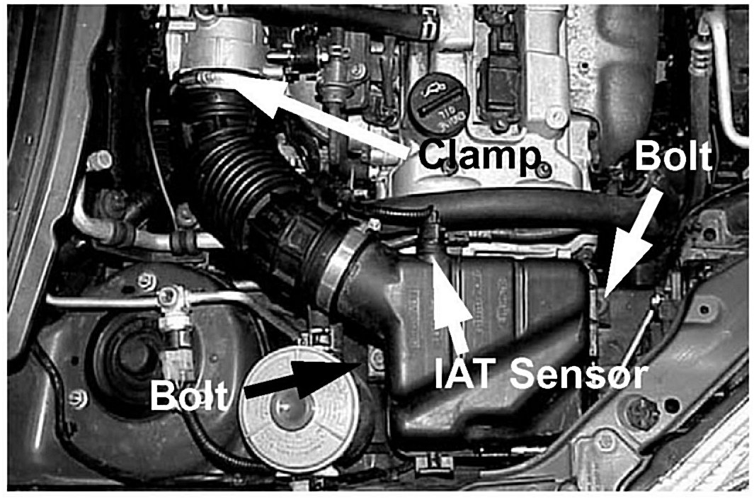 2. Pull the Intake Air Temperature (IAT) sensor out of the air cleaner grommet with plug connected. Loosen indicated clamp and remove two indicated bolts. Pull the air cleaner assembly out of the engine compartment.