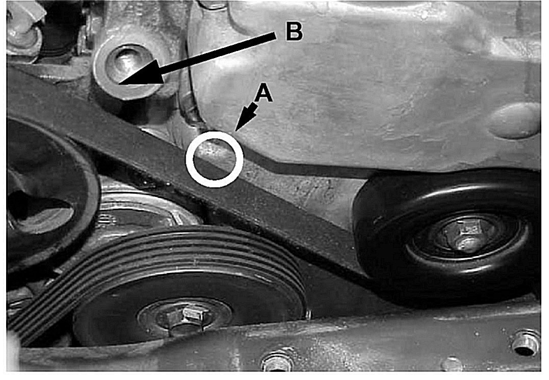 4. Pry the P/S Pump Pulley outward with a small pry bar or flat screw driver at position "B" to remove any thrust play. While holding pressure on the pulley measure the clearance between the timing cover and the serpentine belt at point "A" using a feeler gauge. If the distance measured is between 2.0 mm and 3.3 mm continue to the next step. If the distance measured is less than 2.0 mm or greater than 3.3 do not continue. This procedure has already been done or there is another problem that must be diagnosed. DO NOT bend the pulley, only slight pressure is required.