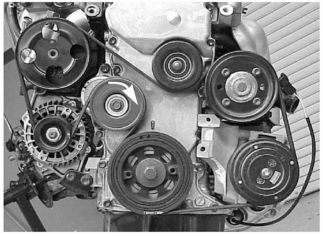 5. Remove the Serpentine Belt by turning the tensioner in the indicated direction.