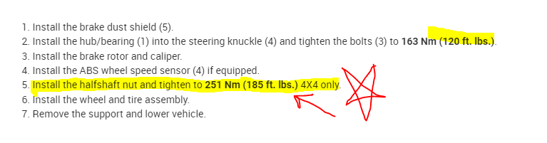 See pics below. Note: It is very important to properly torque the axle nut and the hub nuts to the manufacturer's specifications. Torque specs are in the directions. Do this before placing weight on the bearing assembly (hub). Either have a helper hold the brakes on when performing the final axle torque or slip a strong screwdriver between the fins of the rotor and the opposite side allow it to rest against the caliper mount to prevent the axle from turning when torquing.