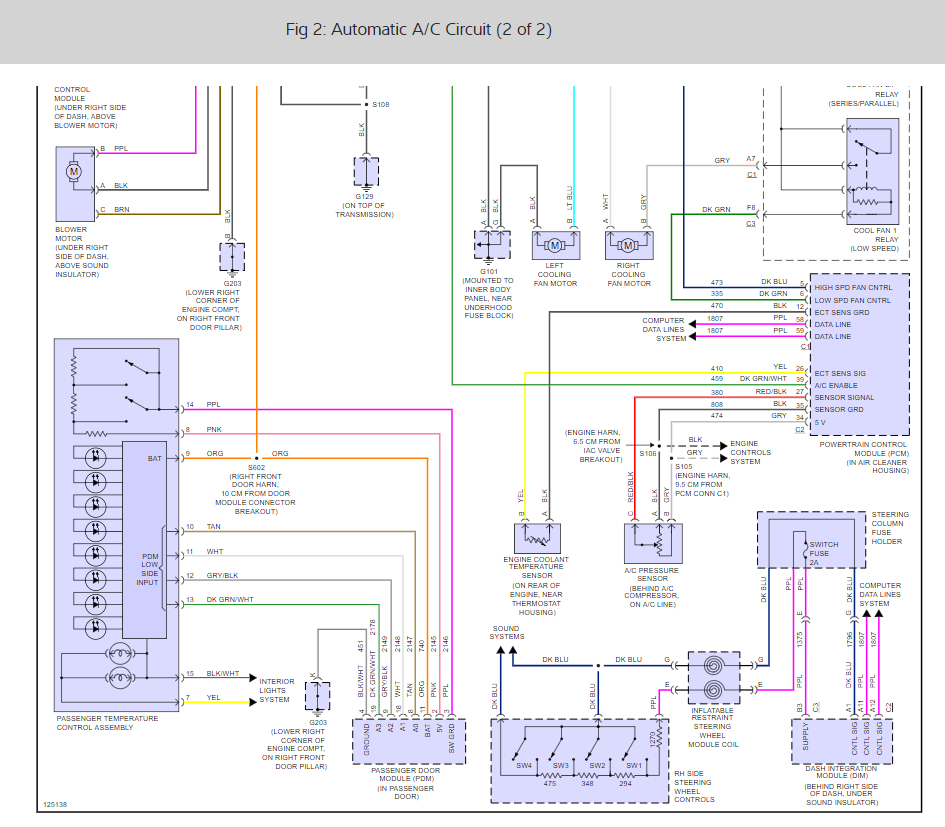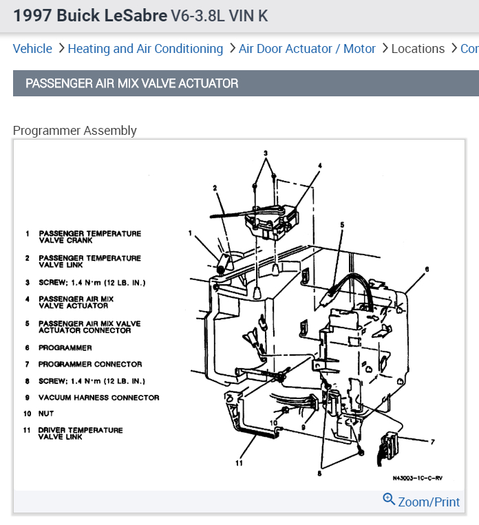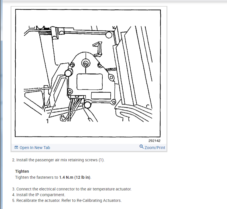 First I recommend a scan with GM scantool to retrieve fault codes, but you can try this if you want. AIR MIX VALVE 1. Remove glove box. Start engine. Set temperature control to 90 °F (32 °C). Set passenger control panel to full WARM position. If ambient temperature is greater than 90 °F (32 °C), disconnect in-vehicle temperature sensor. Allow at least 45 seconds for programmer output cranks to reach full heating position. 2. Gently pull driver air mix valve crank toward programmer until valve contacts stop. Insert threaded portion of link into slot on plastic pin on driver air mix valve crank. 3. Gently pull passenger air mix valve crank toward actuator until valve contacts stop. Insert threaded portion of link into slot on plastic pin on passenger air mix valve crank. See Fig. 1 .