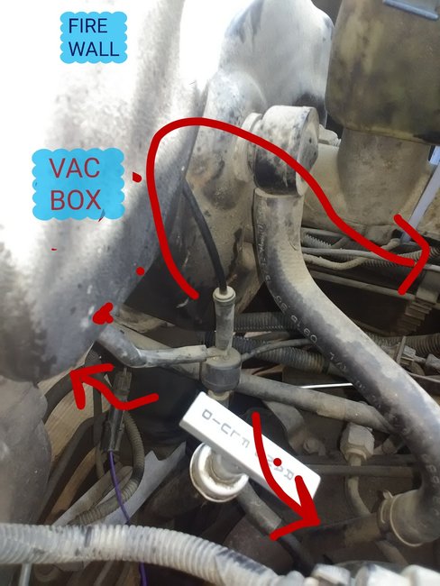 If so, then I do not know where it's missing a hose because that thin black line coming from the valve goes to some EGR looking thing on the engine the other to a metal vacuum line from the engine and the vacuum hose to one of the connectors on the vacuum box.