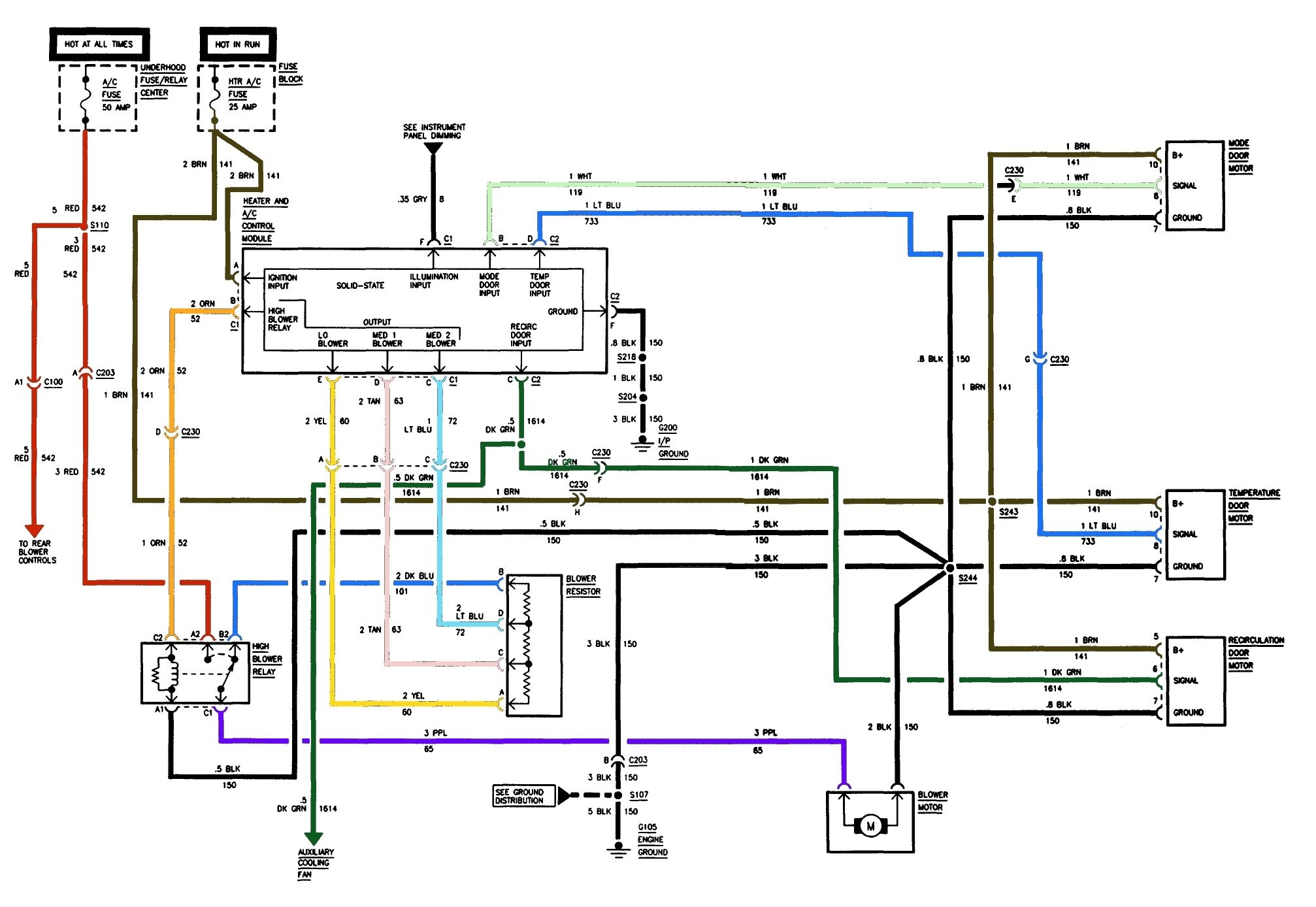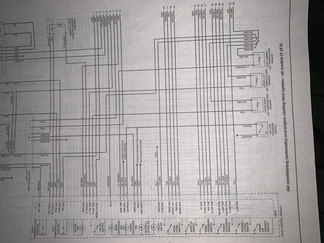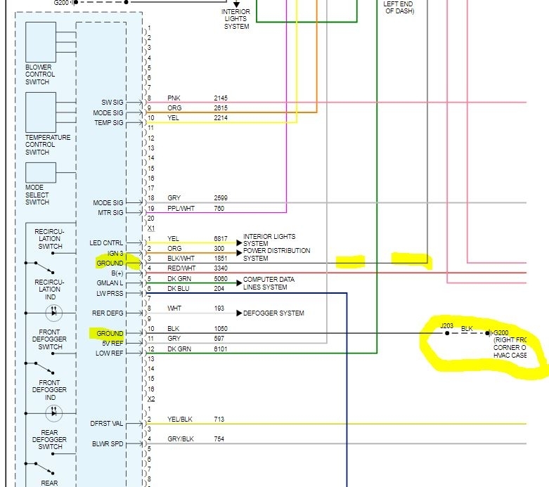 There are three wires going to the actuator that controls the hot/cold blender door. With the key on my volt meter says there are twelve volts on all three wires. As this is a plastic part mounted to a plastic box, one of those must be a ground. I can see one wire moving the door in one direction and the other wire moving it the other direction. So having voltage on all three has to be a problem. I put the old control panel back in just in case but it made no difference.