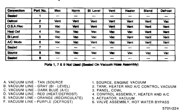 The van listed above is a C3500. I need the diagram for the HVAC dash control vacuum valve for color/path vacuum lines. Color/numbers for each vacuum line coming from the control valve that is pictured. I believe port #8 on the valve is the source. And I believe port #6 is the MAX setting.