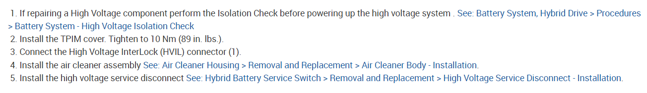 So, we tested the hybrid battery with a voltmeter at the posts under the seat. With the main cables that come from the transmission disconnected and the safety switches connected we only got a .03V reading. The manufacturer said maybe something isn’t connected inside the battery. He is positive the 40 cells are new and charged from Toyota. When read the information on “power up” and isolation codes but don’t understand what exactly it accomplishes. I have the same information on my E-manual for this car.