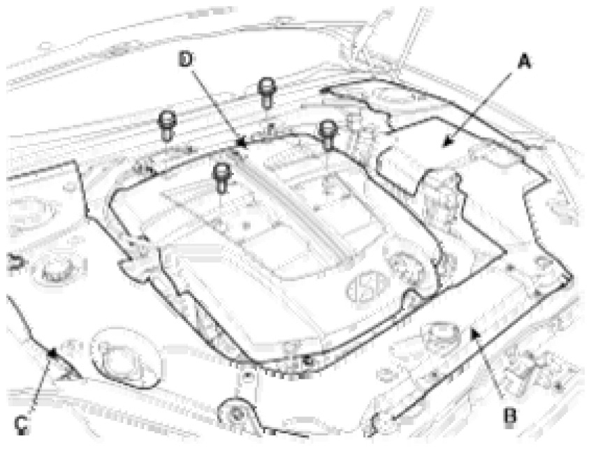 1. Remove the side cover (D) and the engine cover (A, B, C).