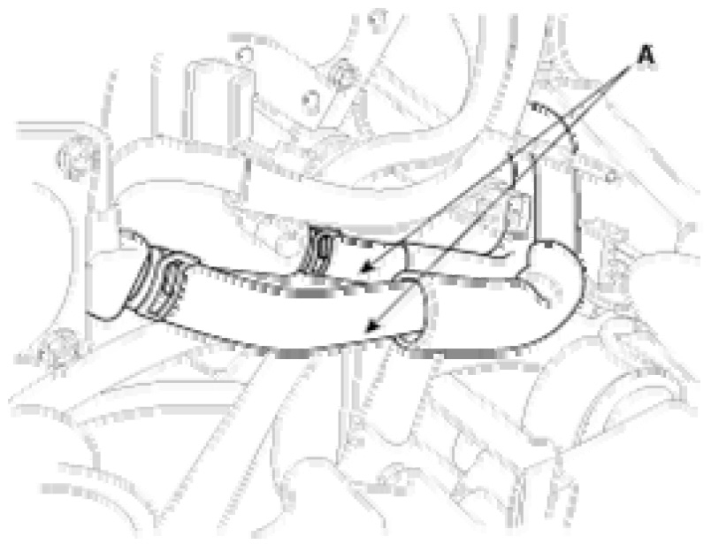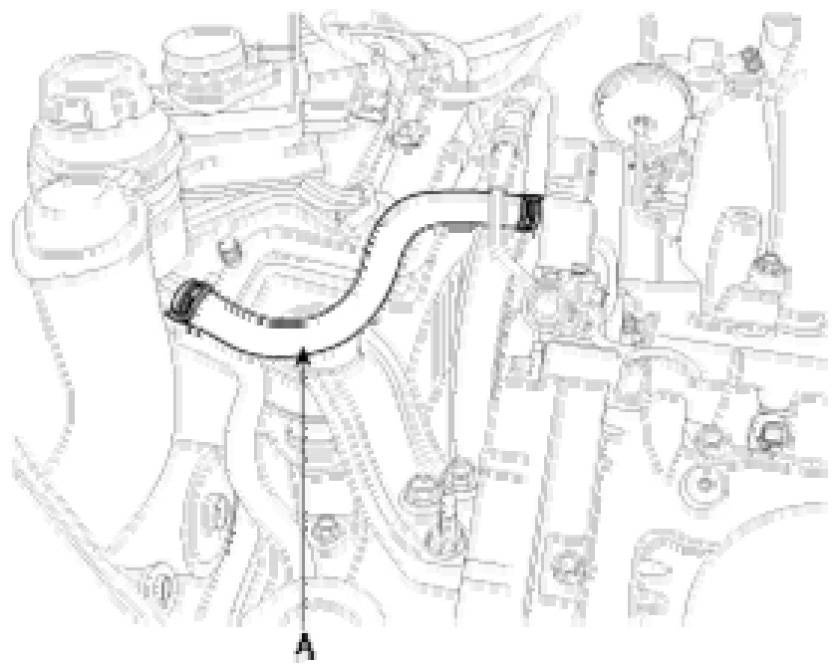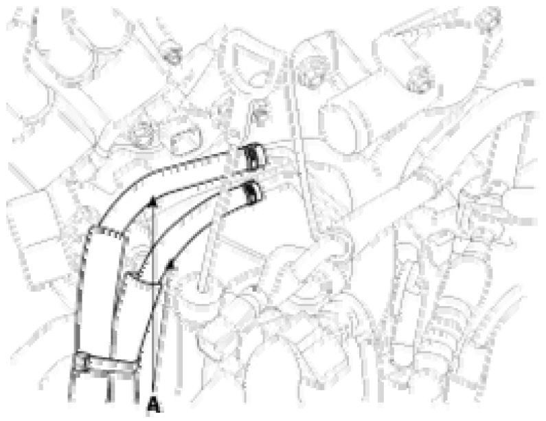 10. Remove the upper radiator hose (A) and lower radiator hose (B).