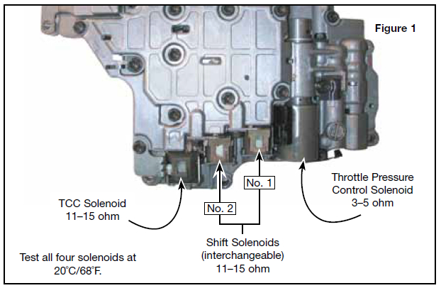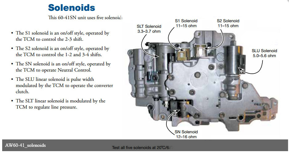 To check shift and pressure solenoids use a voltmeter and check resistance of all five solenoids at 20 degrees C,