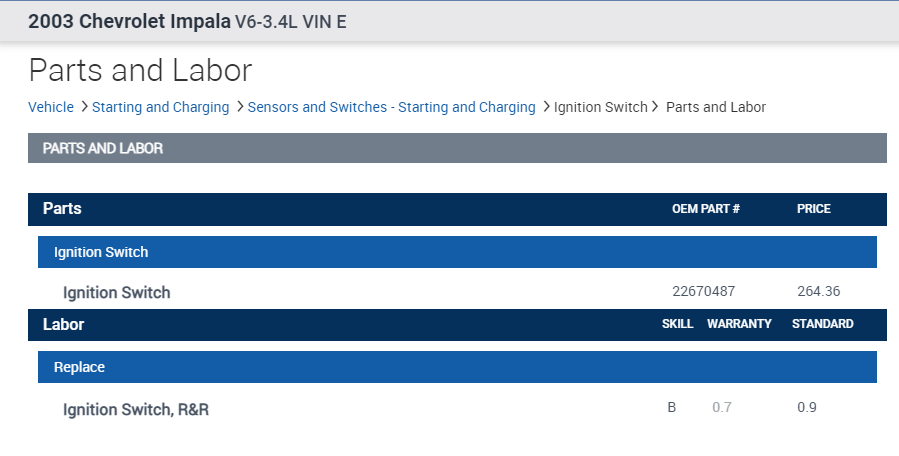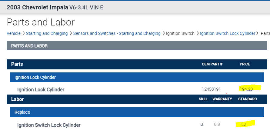 If you look below, I attached two pics. The first is the lock cylinder and the second is the switch. Labor is indicated in hours, so whatever the shop charges hourly will be multiplied by the total number of hours.