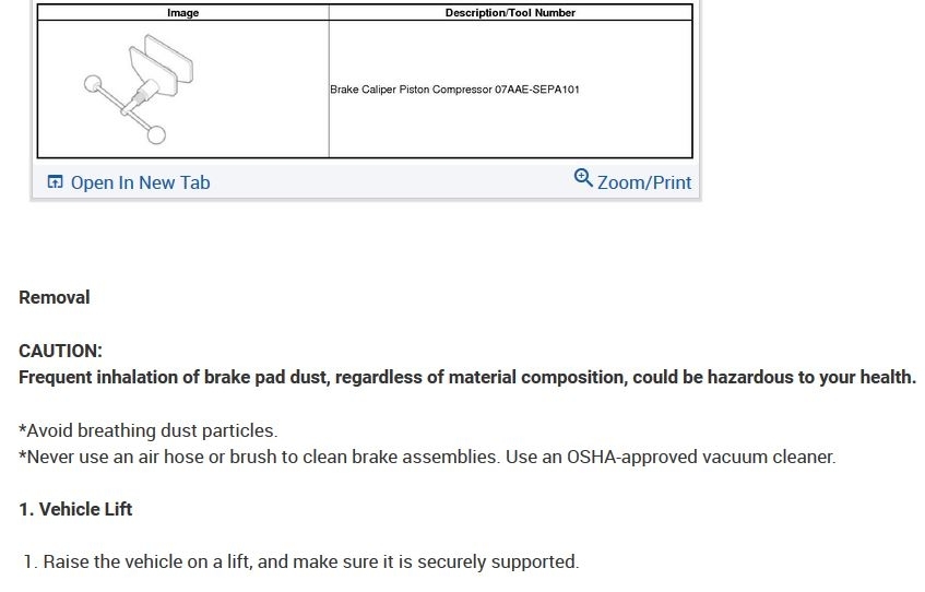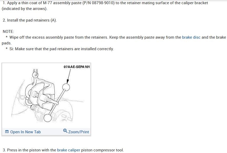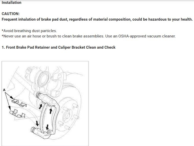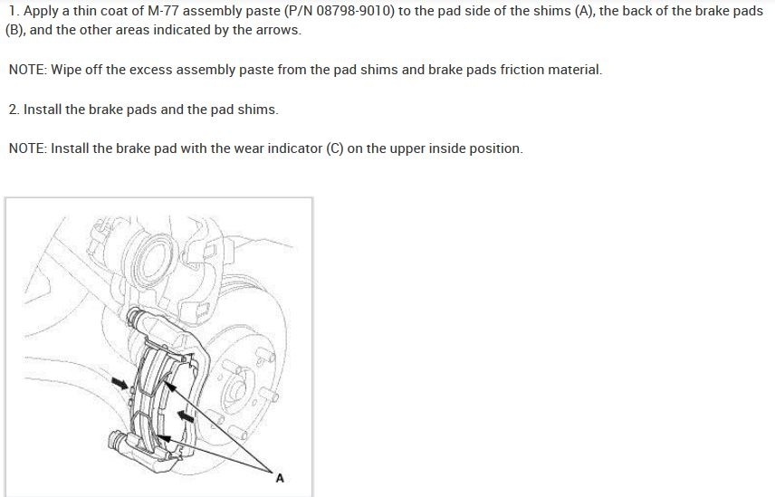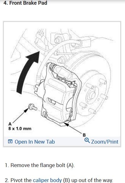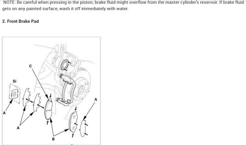 I'm including AllData's instructions on how to change the brake pads on your car in the attached images. Also, I have some additional tips: (1) Take pictures as you go through the process, so you can reference them if needed. (2) You probably don't have a lift at home, so use a jack and back it up with a jack stand under the frame of the car. (3) If you've not added brake fluid to the master cylinder, do not remove any. If you have added some, don't worry about it just yet, excess will come out on it's own in a later step, just wash it off of the painted surfaces quickly. (4) You can use "brake parts cleaner" that the auto parts stores sell to clean things up. (5) Spray some "white lithium grease" on the caliper pins to keep them lubed. (6) They sell a suitable assembly paste at the parts stores, just use that instead of the "M-77 Assembly paste." (7) A larger c-clamp can be used in place of a brake caliper compressor tool, just put an old brake pad on the caliper piston so the clamp doesn't damage the piston. (8) Be absolutely sure to push the brakes all the way at least 10 times before driving anywhere, or you'll be driving with no brakes at all. Also, you can do this entire job with a basic set of wrenches (metric sizes) and a 6 inch or larger c-clamp without trouble.