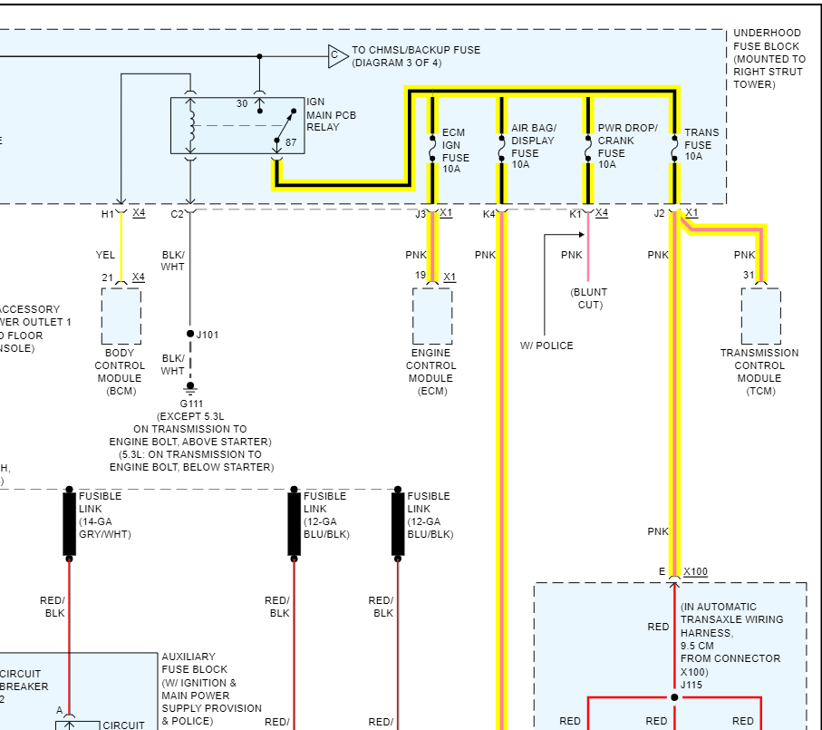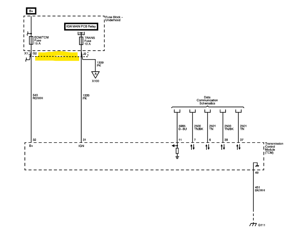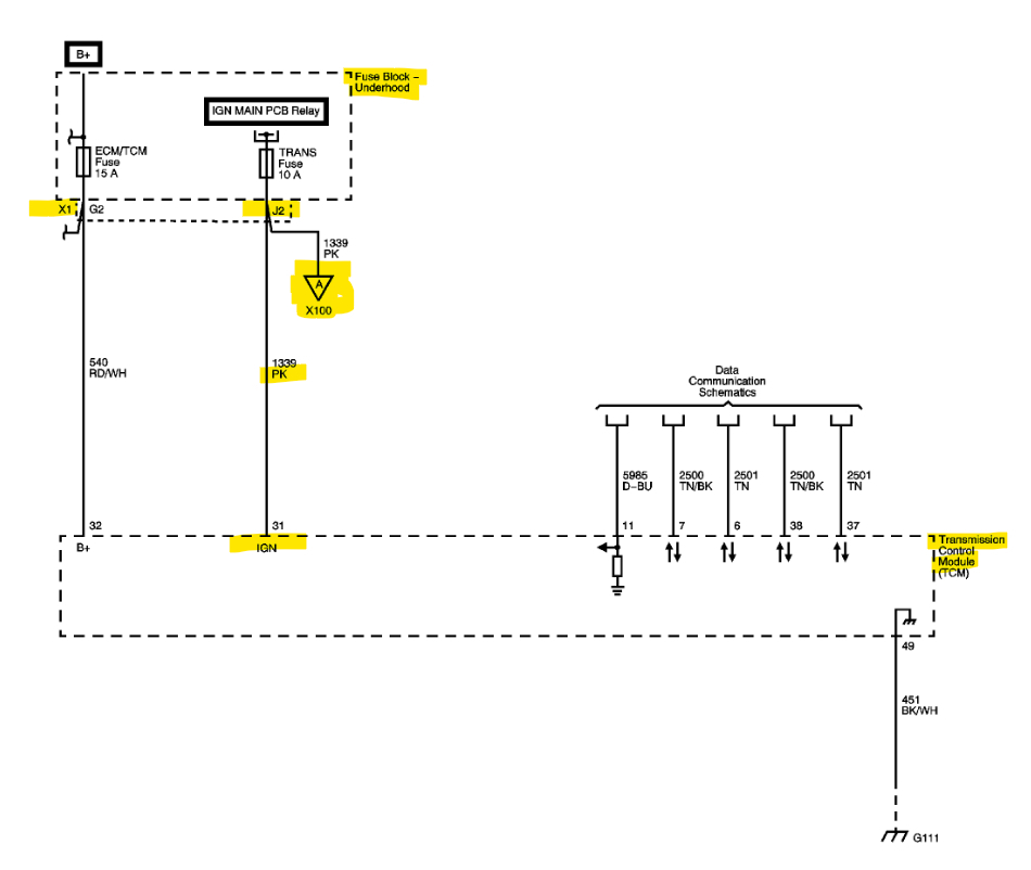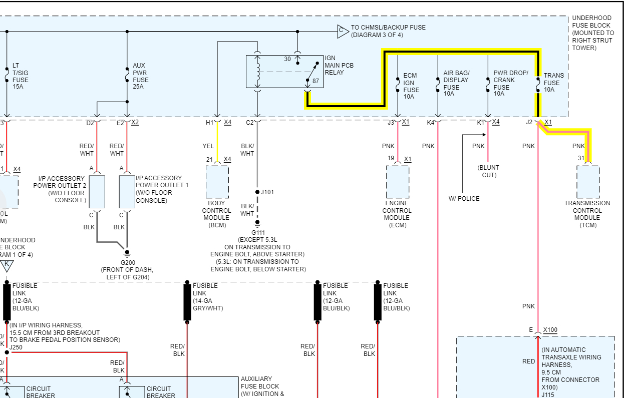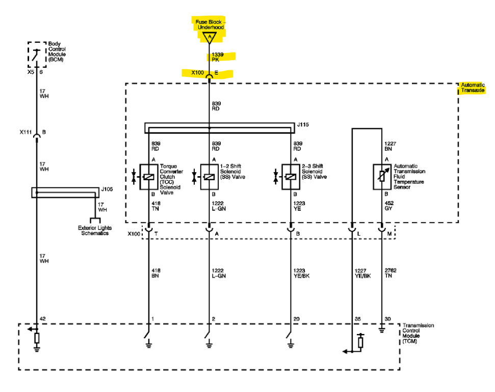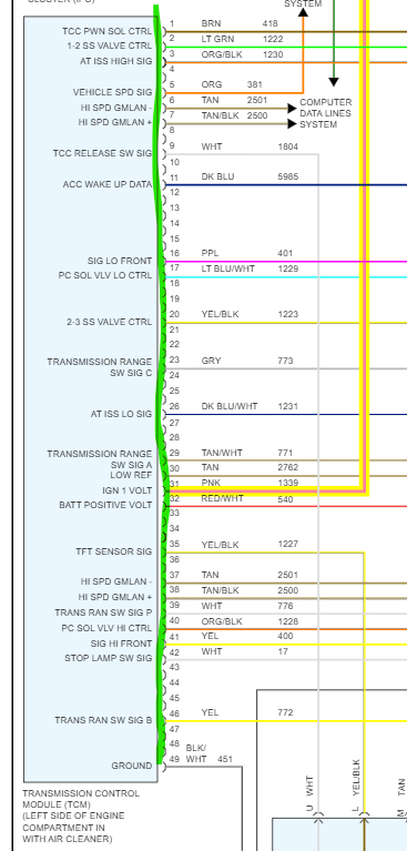 What happened? The ignition wire (pink circuit 1339 or simply 39) from TCM 48-way connector pin 31 to transmission harness 20-way connector pin E showed no continuity. Is this normal when the key is in the off position? Does this wire go through a fuse or fusible link? The wiring diagram shows transmission fuse 4 in the junction block but no fusing in the wire in between pin 31 and pin E unless I am not reading the diagram correctly. All other connections showed continuity