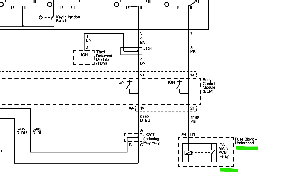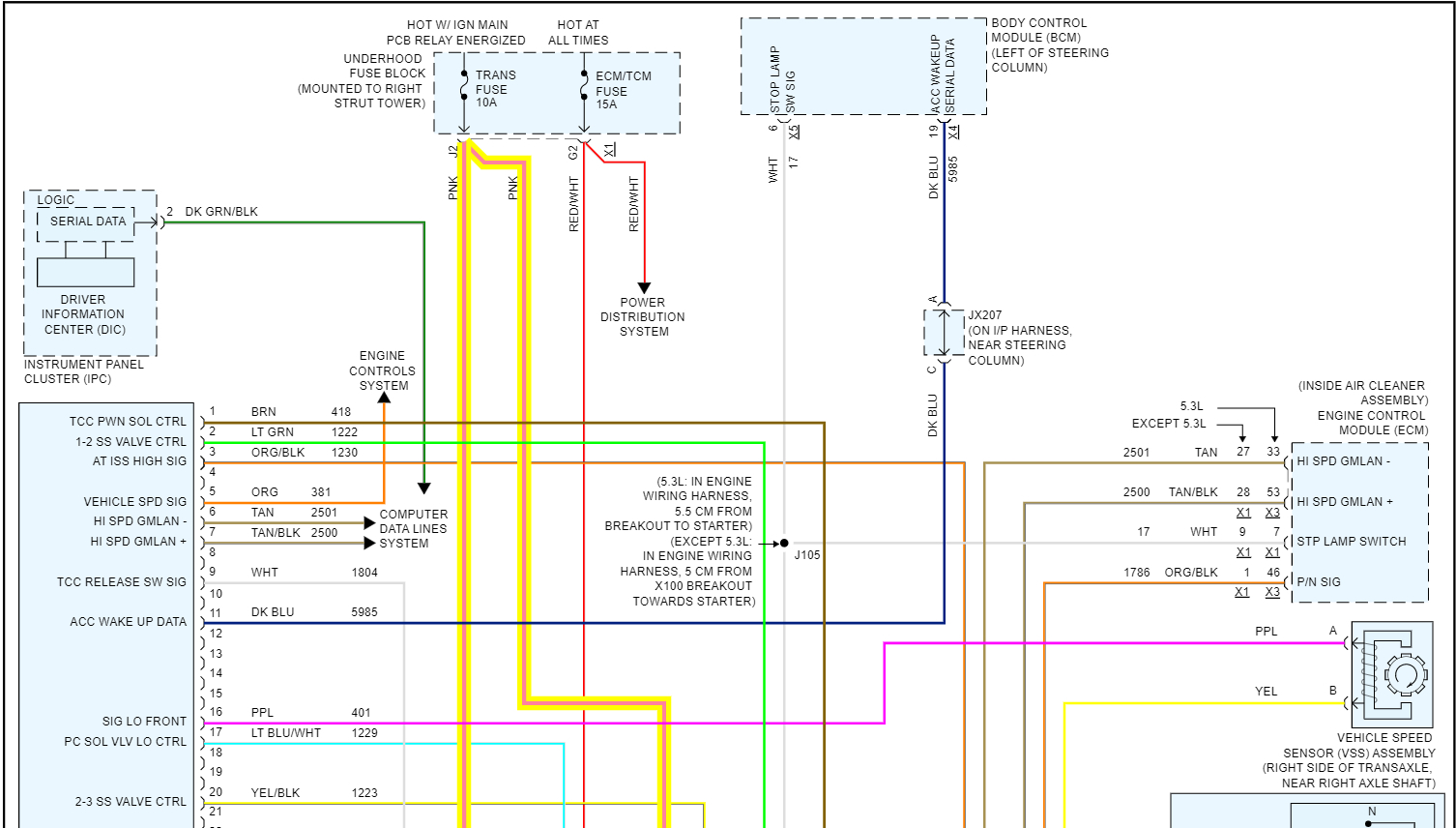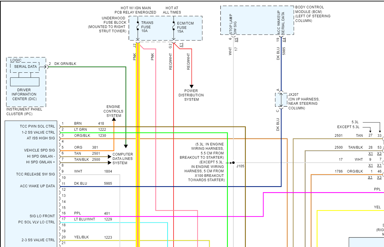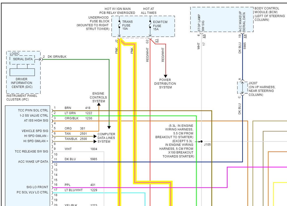 What happened? The ignition wire (pink circuit 1339 or simply 39) from TCM 48-way connector pin 31 to transmission harness 20-way connector pin E showed no continuity. Is this normal when the key is in the off position? Does this wire go through a fuse or fusible link? The wiring diagram shows transmission fuse 4 in the junction block but no fusing in the wire in between pin 31 and pin E unless I am not reading the diagram correctly. All other connections showed continuity