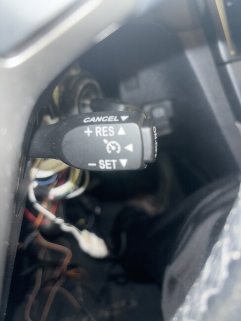 It looks like this car has cruise control, do you see the up and down arrows on the steering wheel and the set/cruise off and on where the level on the right, these are for the cruise control.