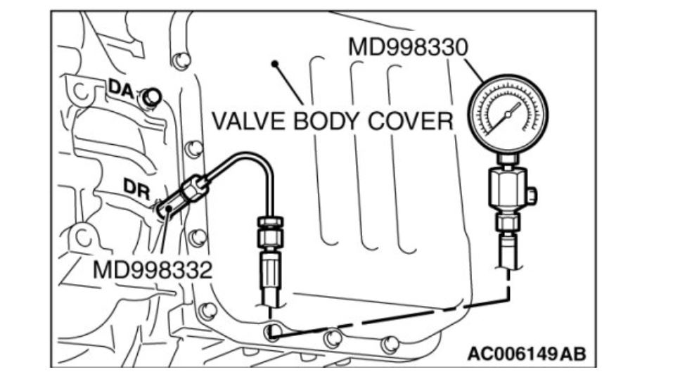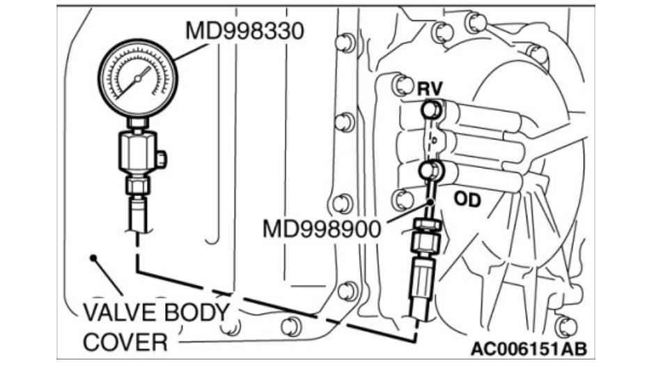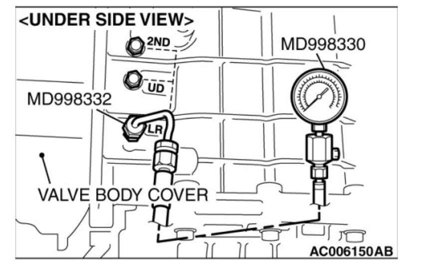 3. Connect the special tools (3.0 MPa (427 psi) oil pressure gauge [MD998330] and adapters [MD998332, MD998900, MB992018 [5A/T]]) to each pressure discharge port.