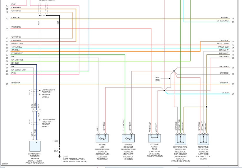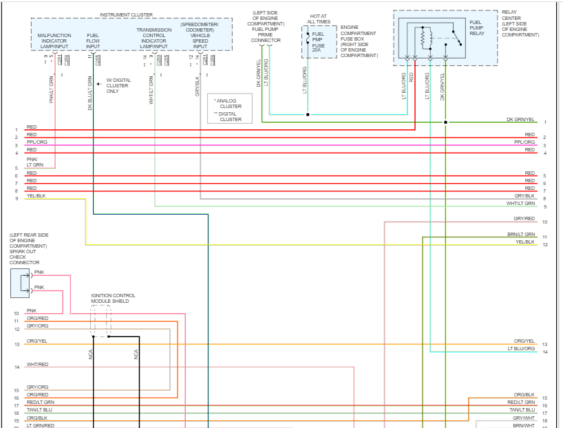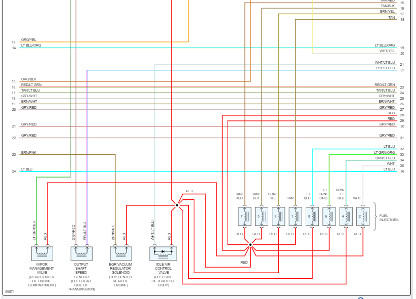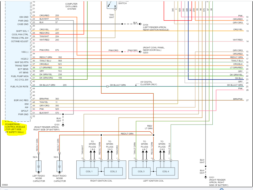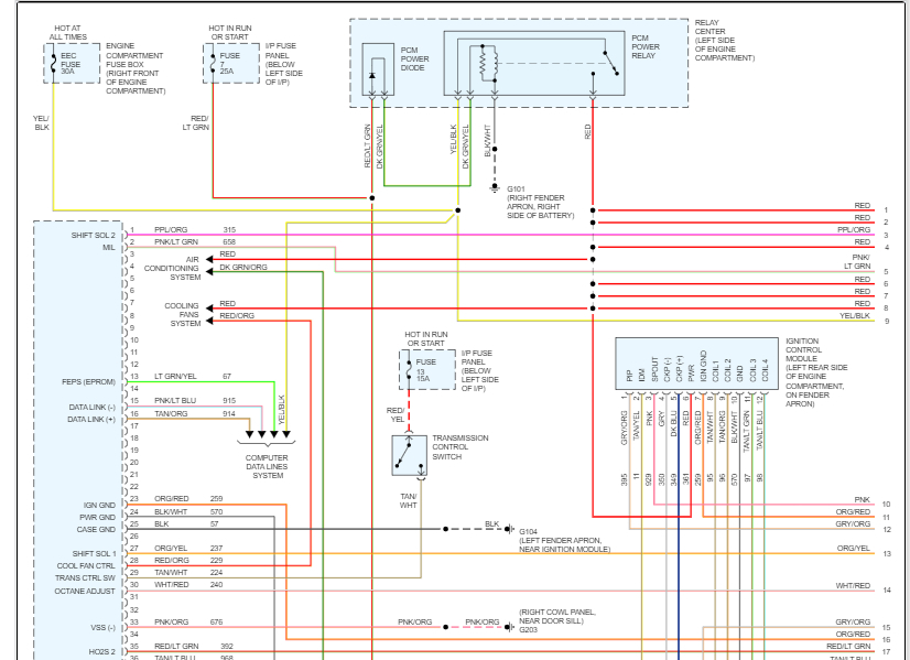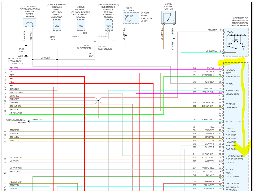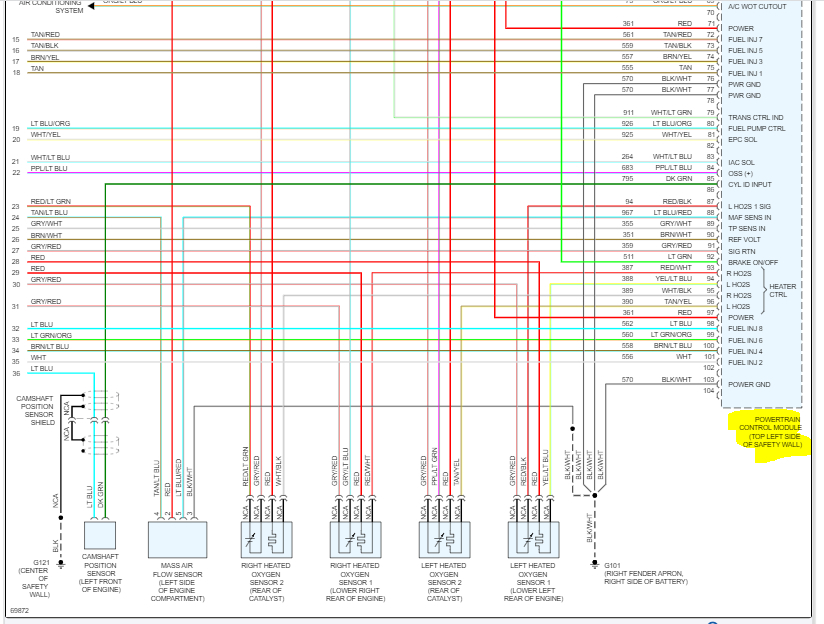 I attached the entire powertrain management system schematics below for you. I had to cut each pic in half to make them readable for you, but I did overlap them so you can follow from one the next.