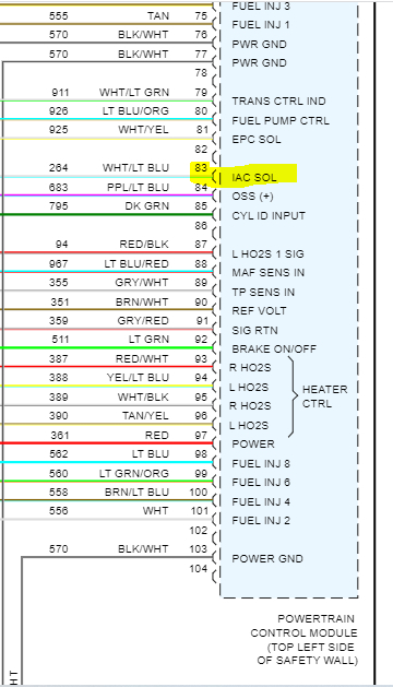 Again, thank you for the diagrams. They saved a lot of time testing/guessing. It looks like I'll be needing a new (reman.) PCM. But here's what I did in case it will help someone else. First, I tested the red wire for power with key on/engine off using a test light. Power=ok. Used a noid light (a test light will work if careful not to damage the connector contacts) in the connector and turned key on/engine off. No light. Next, disconnected the PCM harness at the PCM and found the 83 pin. Tested continuity between harness connector 83 and IAC connector Wht/LtBlu. Continuity=ok. So, no breaks in wiring/harness between PCM and IAC valve. Valve was replaced with new last week. Yeah, guilty of throwing parts at it.