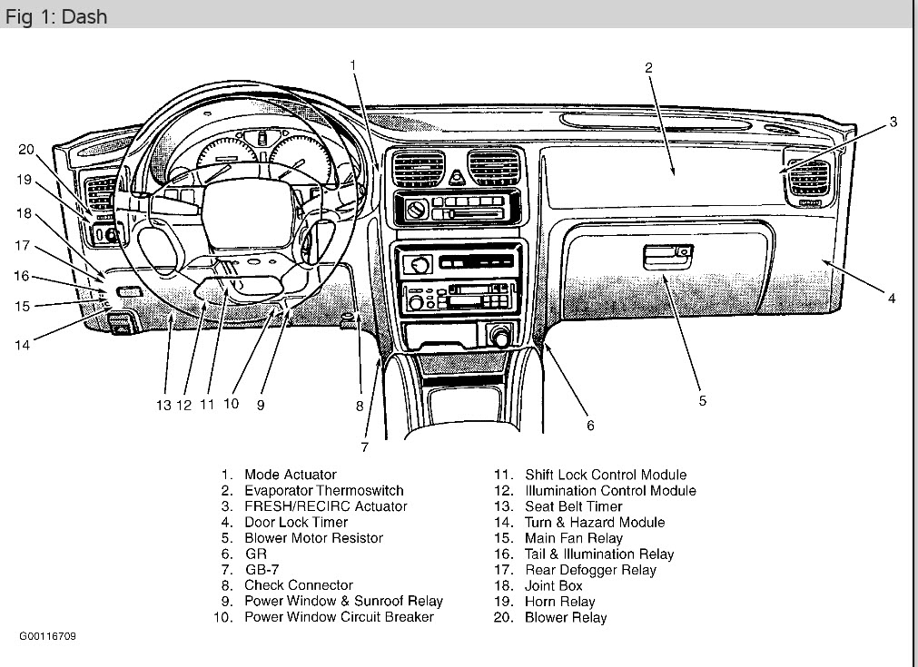 missing relay and or control box after some work under dash. it clips to a bracket and mounts to heater box on left. it has two plugs one gray one light tan, they are wide look like a computer interface port plug shape. I have seen same year with one gray and found one with connectors like mine, but relay gone. looked through forty junk cars only that one match no relay or control unit. went to dealer with VIN number and they gave me a story about needing one before that did not match Vin number print out like mine. my print out is showing a one plug like 99% have, but the one junk match was identical car except color. without them no power to right window or rear windows or air bag, that light is on. also, probably one plug color and the other plug color probably this have no turn signals or hazard lights. been to a mechanic a while and know 1996 is know for this lack of information at the dealer and can be a mix match car. if i can identification it i can find it. stuff happens in a shop, but do not know how they lost it.