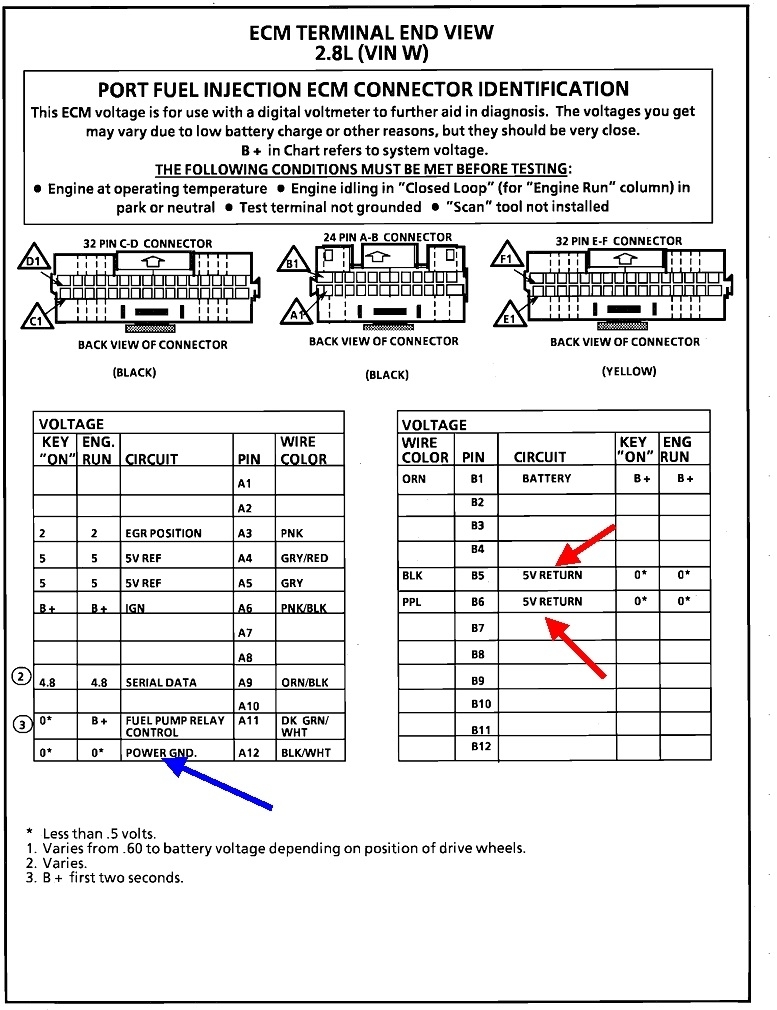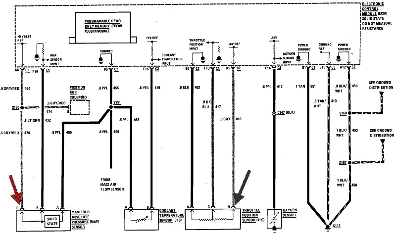 These three diagrams cover most of your engine controls. If you have trouble seeing them, I can cut them into pieces that I can enlarge for you. In particular, look at the two arrows I added in the second diagram. The red arrow is pointing to the 5.0-volt supply to the MAP sensor, and the gray arrow is pointing to the 5.0-volt supply to the TPS. Normally they use just one wire to supply multiple sensors, so when you're getting multiple "low voltage" fault codes, it's related to that one wire. Here they're using a separate wire for each sensor, but they still all originate from a single regulator circuit inside the computer. My suspicion is you're going to find one of these wires is shorted to ground, or both of them are open, meaning they have a break in them.