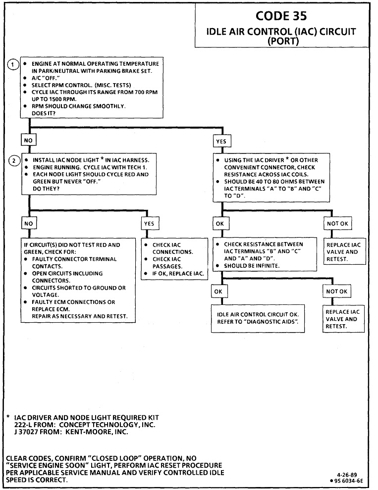 Two-digit diagnostic fault codes are relatively primitive and aren't as informative as on '96 and newer models. In this case, code 35 points to a circuit defect, suggesting wires and connector terminals. It's common for those to have intermittent problems. While the problem can show up and clear up any time, once the fault is detected, even for an instant, the code stays in memory until it is erased. A circuit defect will prevent the IAC motor from rotating, so any rpm change would have to be caused by outside variables, such as vacuum leaks.