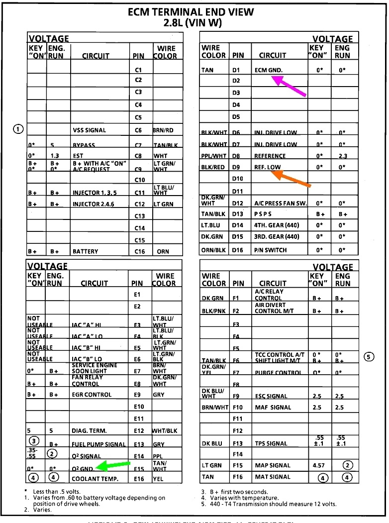 Here's the diagrams for the plugs for your Engine Computer. I found five ground wires here, but they aren't necessarily two for each circuit. For example, they use a separate wire for the oxygen sensor, (green arrow in the second diagram), probably for the same reason as a slight voltage interference from other circuits would adversely affect the O2 sensor's readings. "Reference" or "reference low" are designations for ground wires.
