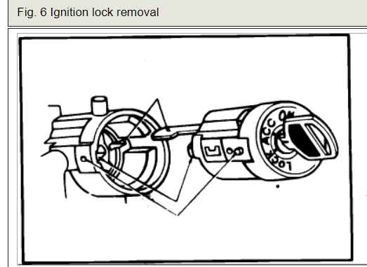 Insert a small diameter rod into hole located on side of lock cylinder, then while holding down pin, remove lock cylinder, Fig. 6.