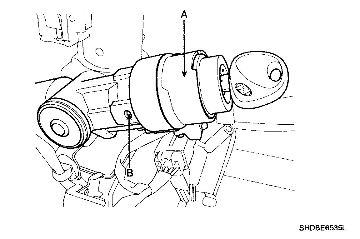 6. If it is necessary to remove the key lock cylinder (A), Remove the key lock cylinder (A) after pushing lock pin (B) with key ACC.