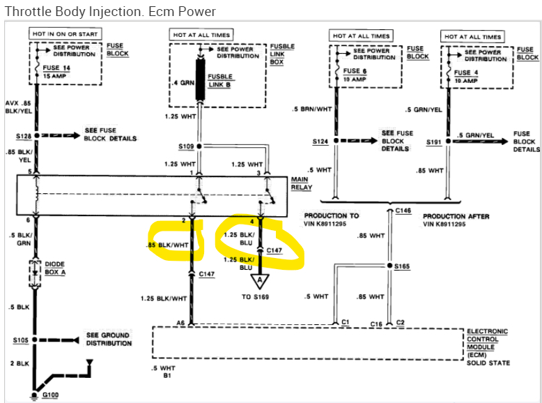 Hello, because of the vehicles age, it's very difficult to find the correct wiring diagrams. Is it Fuse #14 you have to pull? It sounds like you have a relay that has some carbon build up on the contacts and is keeping a circuit to the ECM active. Can you pull the Main Relay here in the diagram below and see if it will stop the engine? Also, when the issue does happen before you pull any fuses or do anything else. You should see which pin on the ECM is still receiving 12volts. If it's (in green) this ECM Pin A6 black/white wire, then you would know it's this main relay keeping its contacts active. Again, we have very limited wiring diagrams, so any fuse number that you're pulling, or additional info would help. But a relay staying on is really the only thing I can see to keep the engine running. Unless there's a circuit inside the ECM that has a corroded and causing contact. But checking any connectors for corrosion would help too.