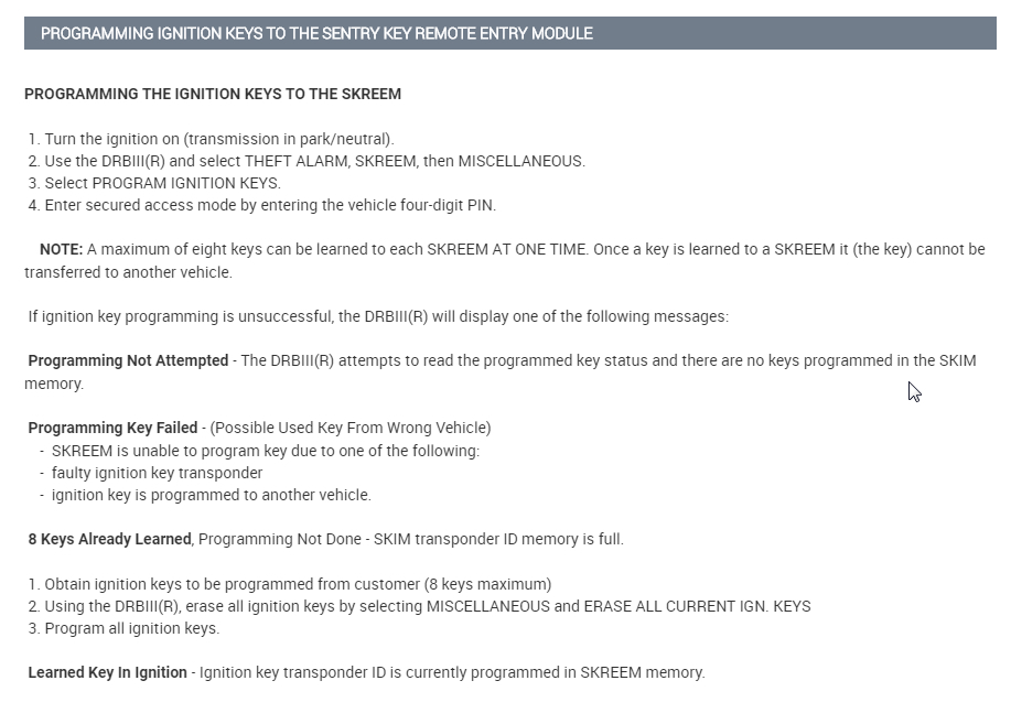 The steps required to reprogram Sentry Keys with two valid Sentry Keys follows: