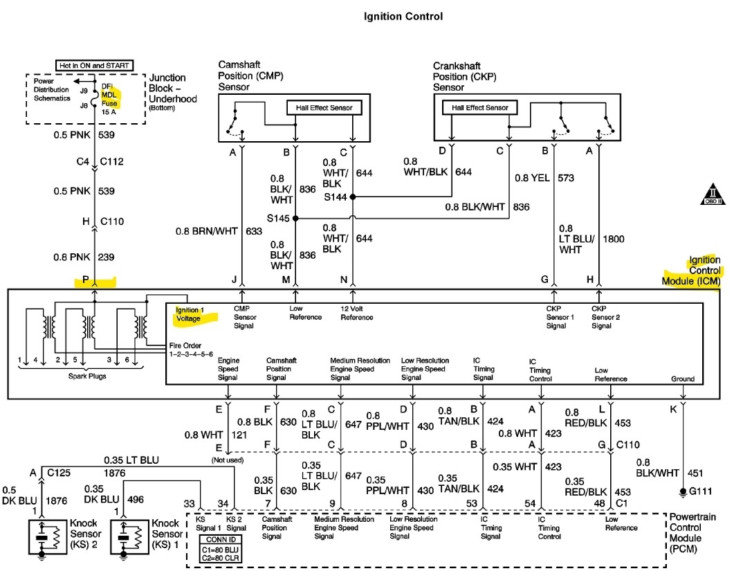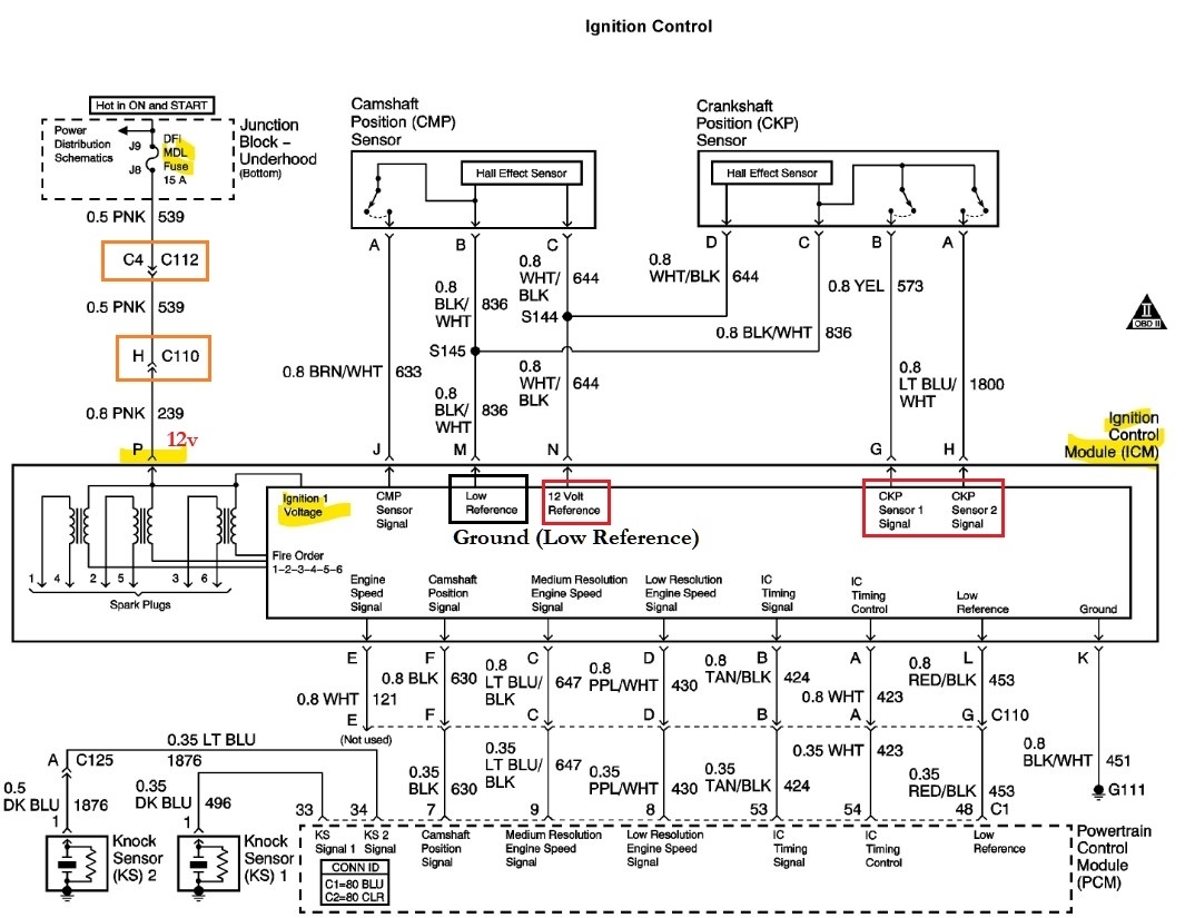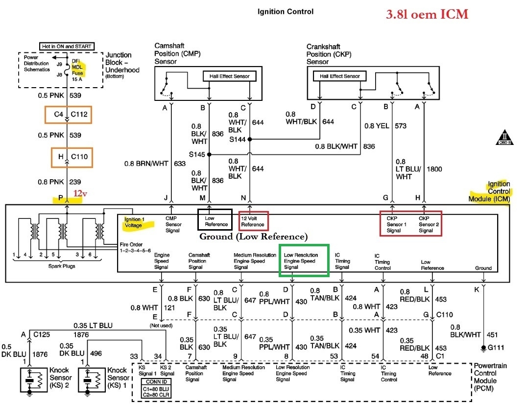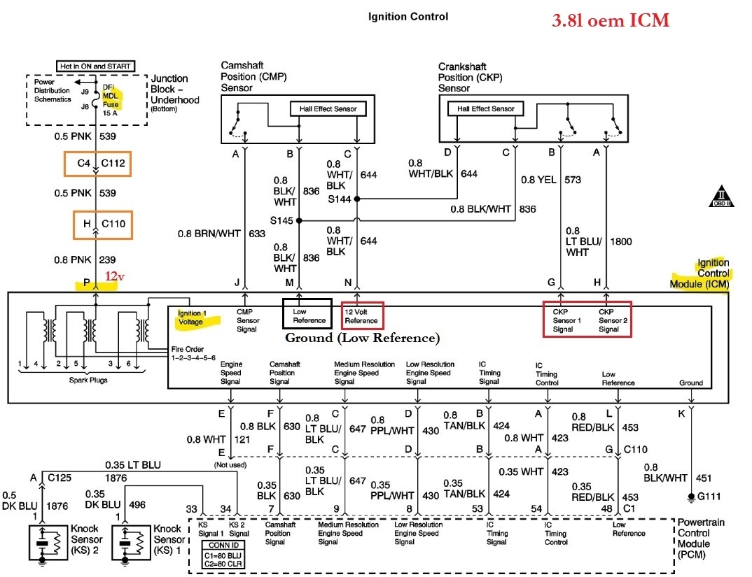 I put my multimeter on the icm harness terminal p pink power and terminal k black/white ground wire which goes to the block and got more than 12 volts. I loaded the circuit with a test light and got over 12 volts. I was told the pink wire feeds the coils.