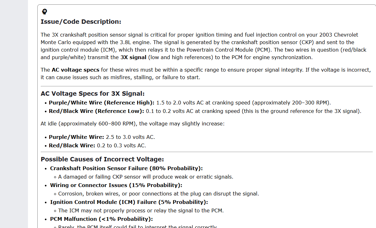 I may or may not check my 18x and 3x voltages coming out of the icm. I may or may not turn the crank by hand and measure the crank sensor dc volt outputs. but i all ready have a rpm reading and crank sensor outputs.