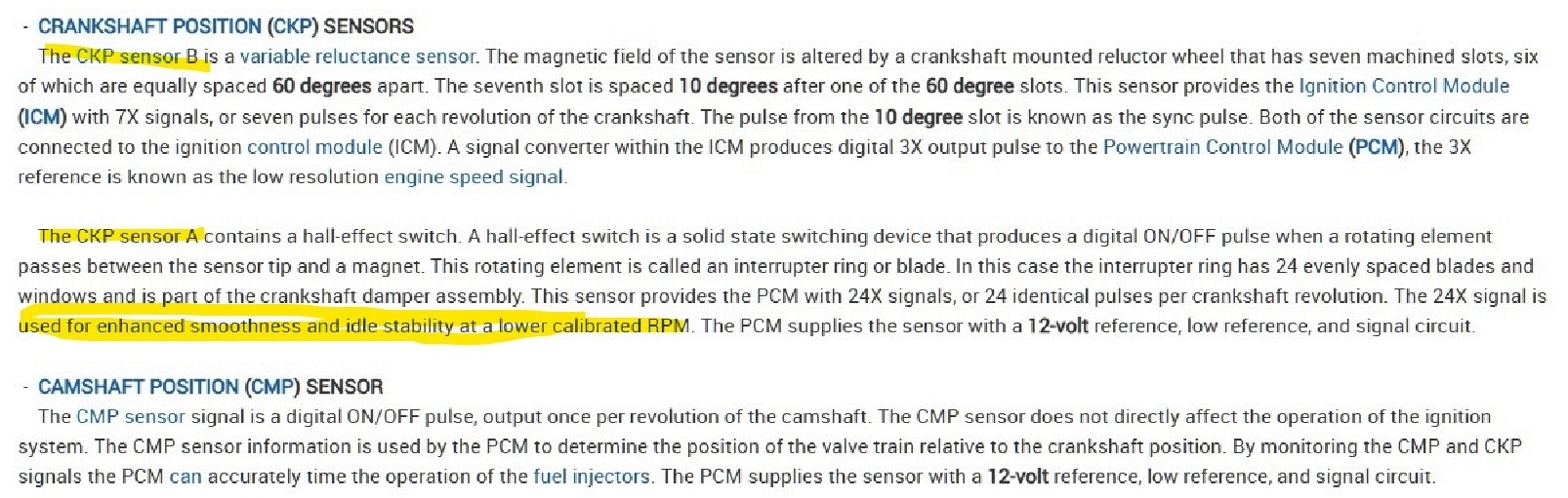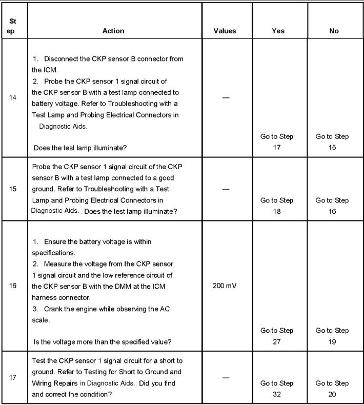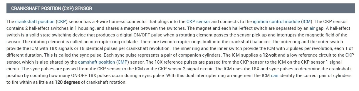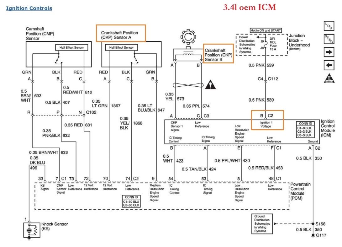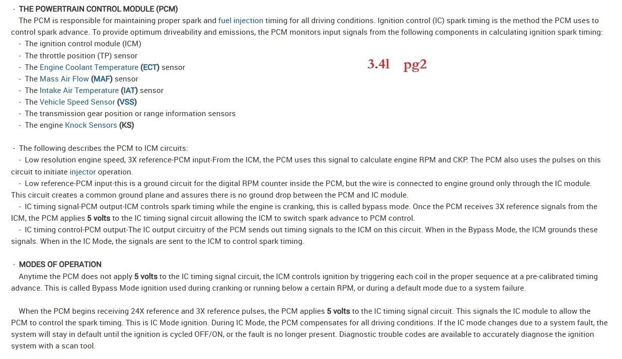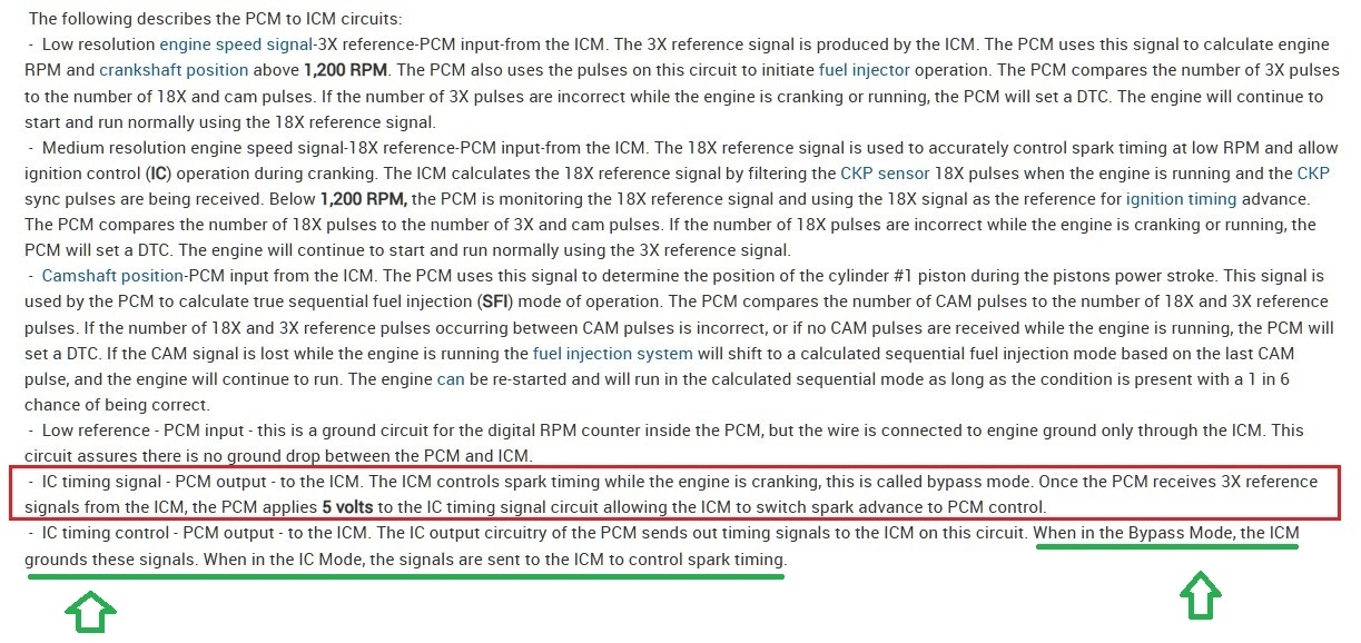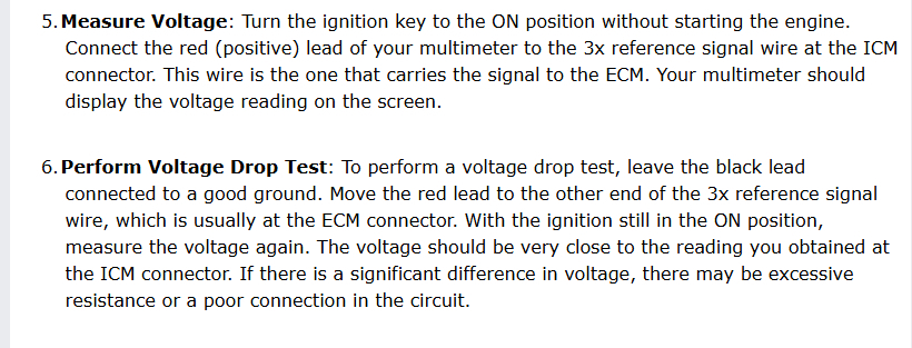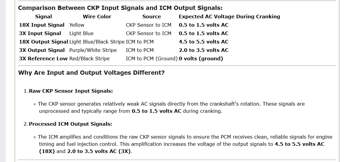 I then measured the 18x crank sensor signal wire going into the icm terminal g yellow wire. I measured at the icm with a multimeter and it shot up 3.5 ac volts while cranking with no minimum voltage. I was told my multimeter is too slow to read it. On the 3x signal wire i got 1.7 to 2.8 ac volts while cranking terminal h light blue/white wire.